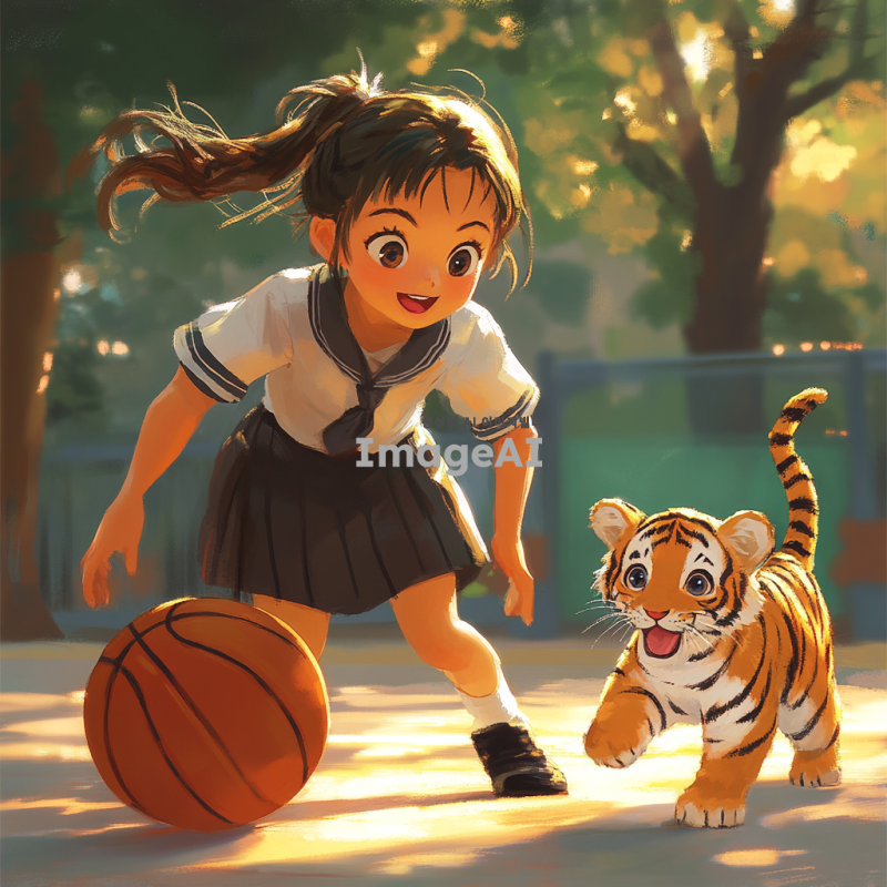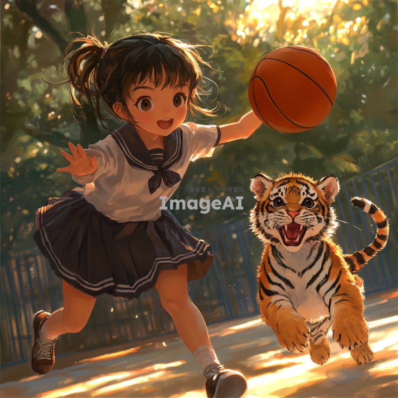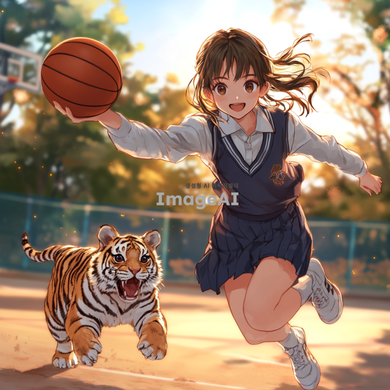고급스러운 교복을 입은 한국인 소녀가 밝고 활기찬 표정으로 학교 운동장에서 농구를 하고 있는 모습, 소녀의 옆에는 귀여운 아기 호랑이가 함께 뛰어다니며 즐거워하는 장면, 소녀의 눈빛은 자신감과 독립심이 가득하며, 주변에는 따뜻한 햇살이 비추고 있는 배경.