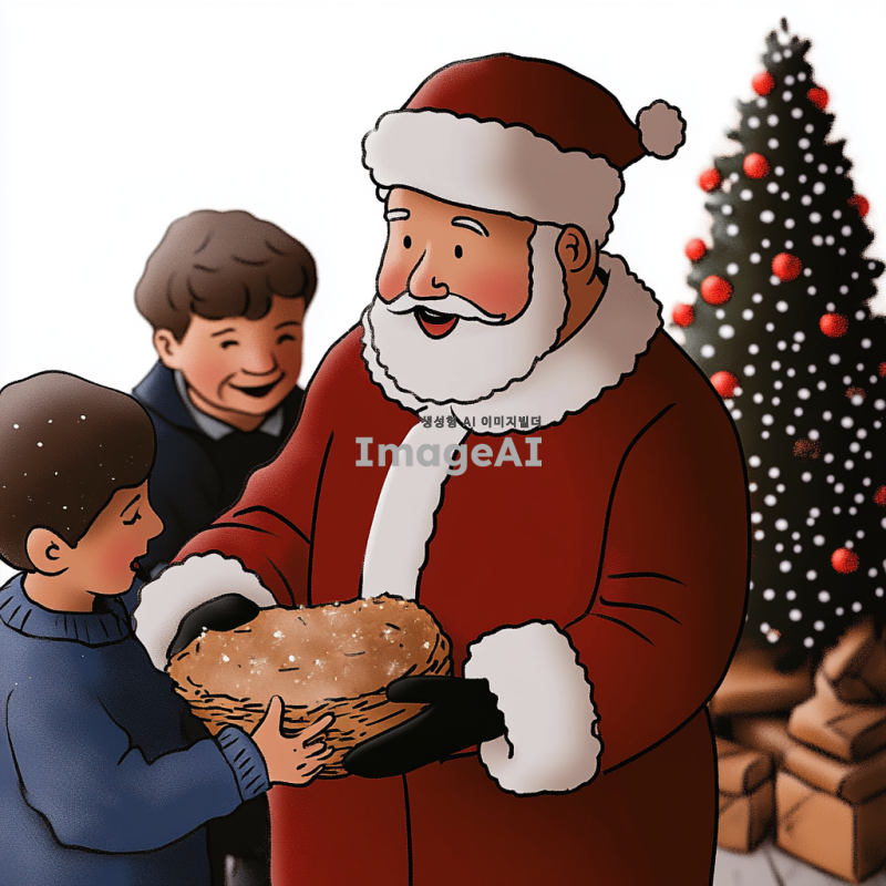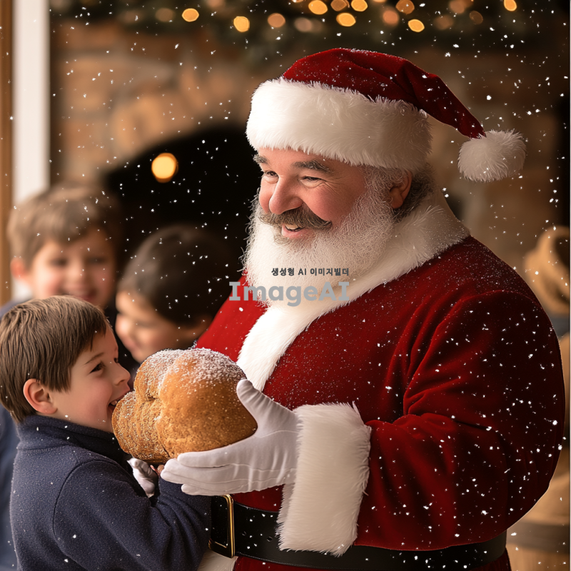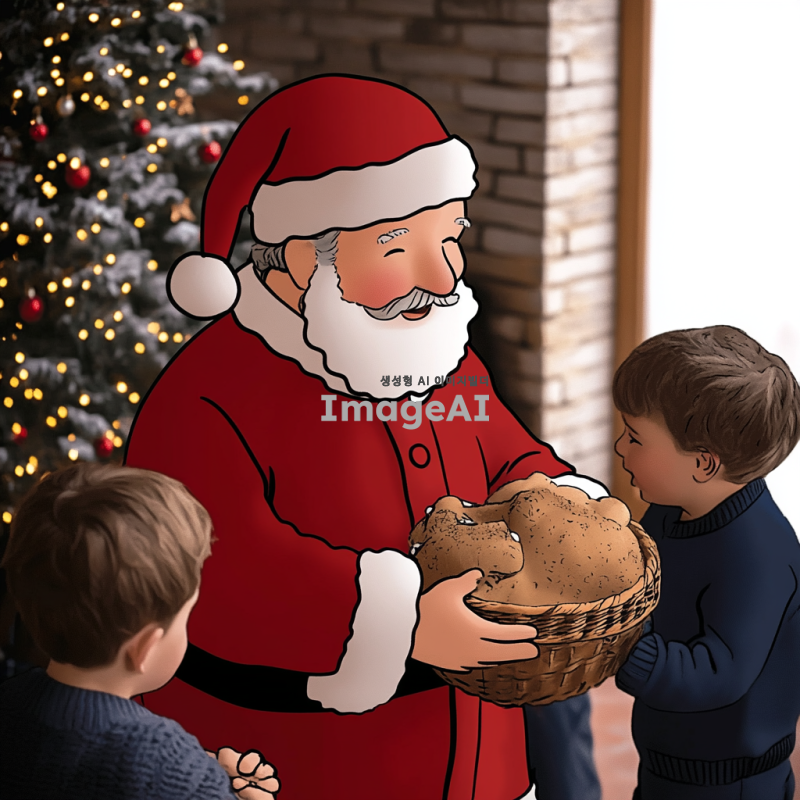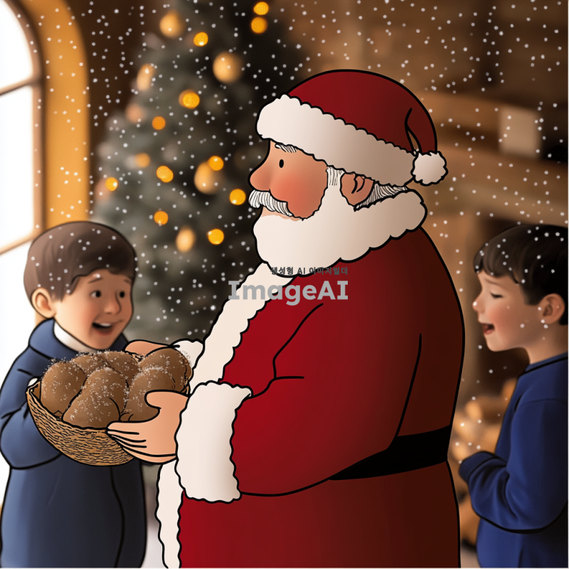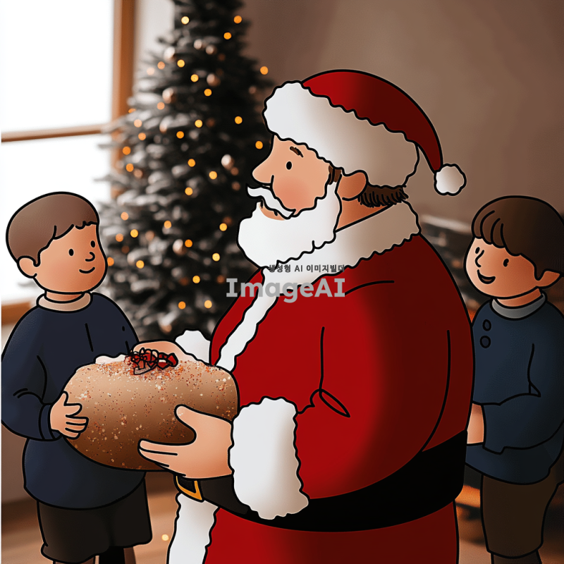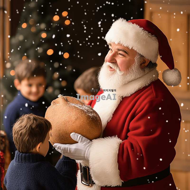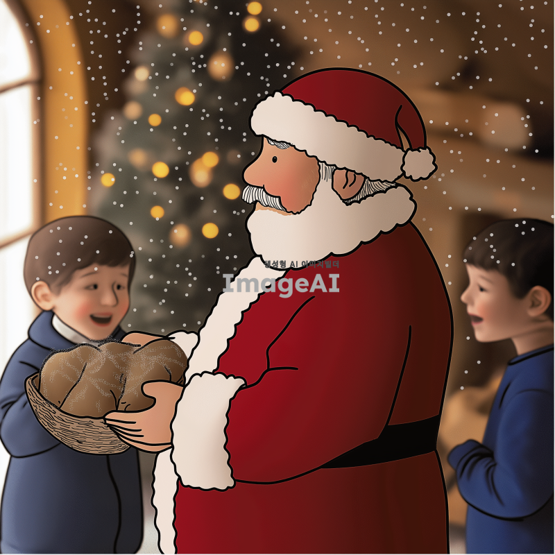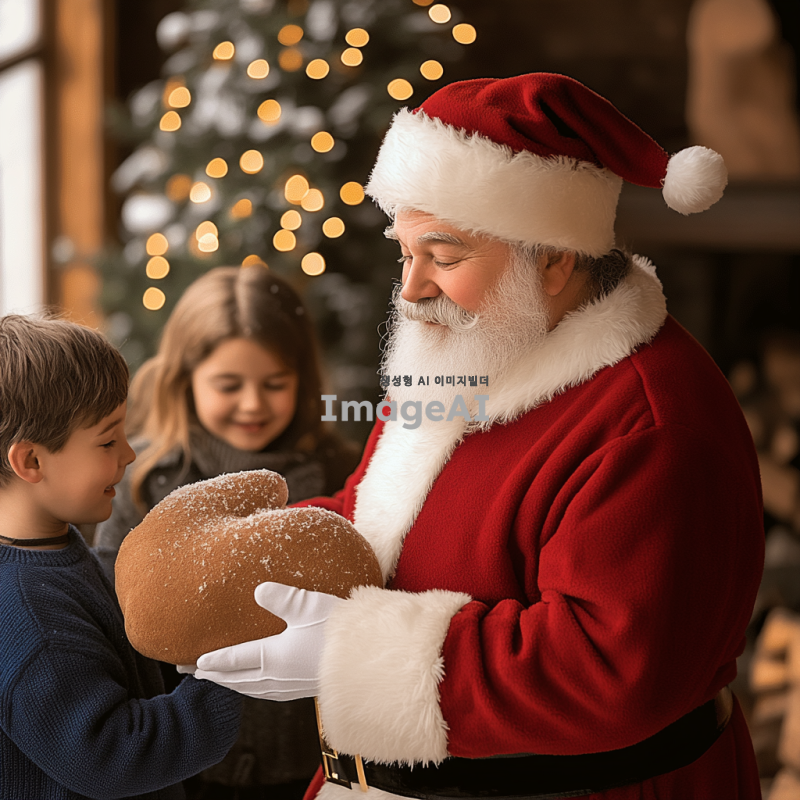 크리스마스 분위기의 따뜻한 거실에서 선물을 나눠주는 산타할아버지, 벽난로 옆에 놓인 크리스마스 트리와 반짝이는 장식들, 행복한 표정의 아이들이 산타할아버지 주위에 모여 있는 장면, 부드러운 눈이 창밖으로 내리는 겨울 풍경, 산타할아버지는 전통적인 붉은 옷과 흰 수염을 가진 모습.