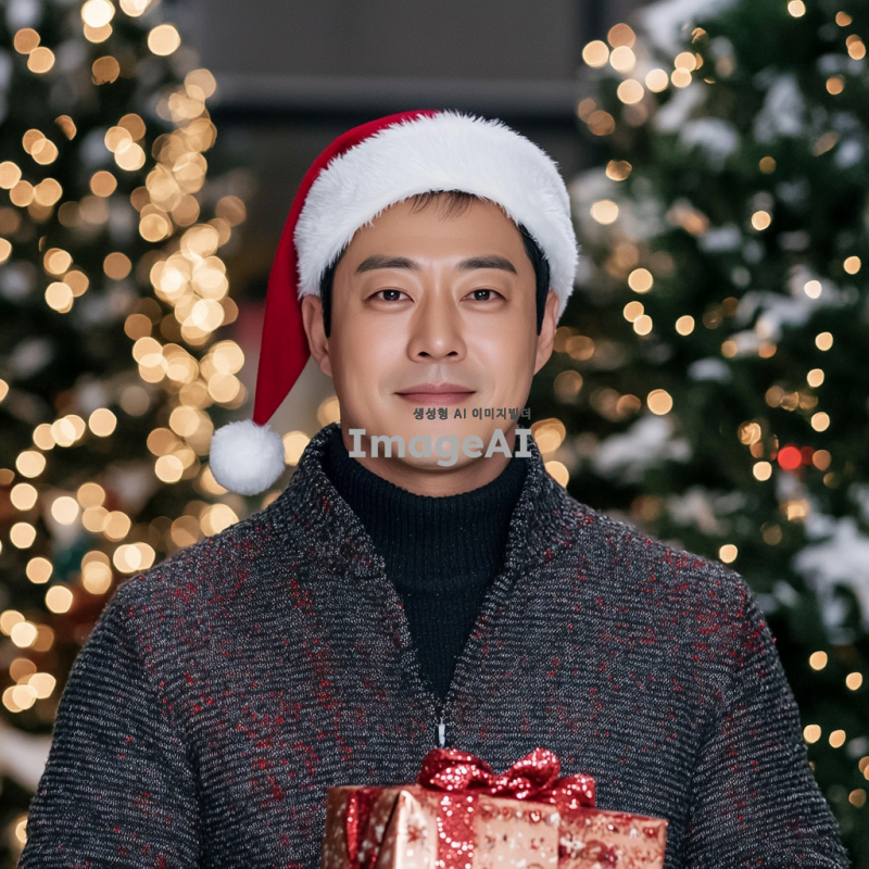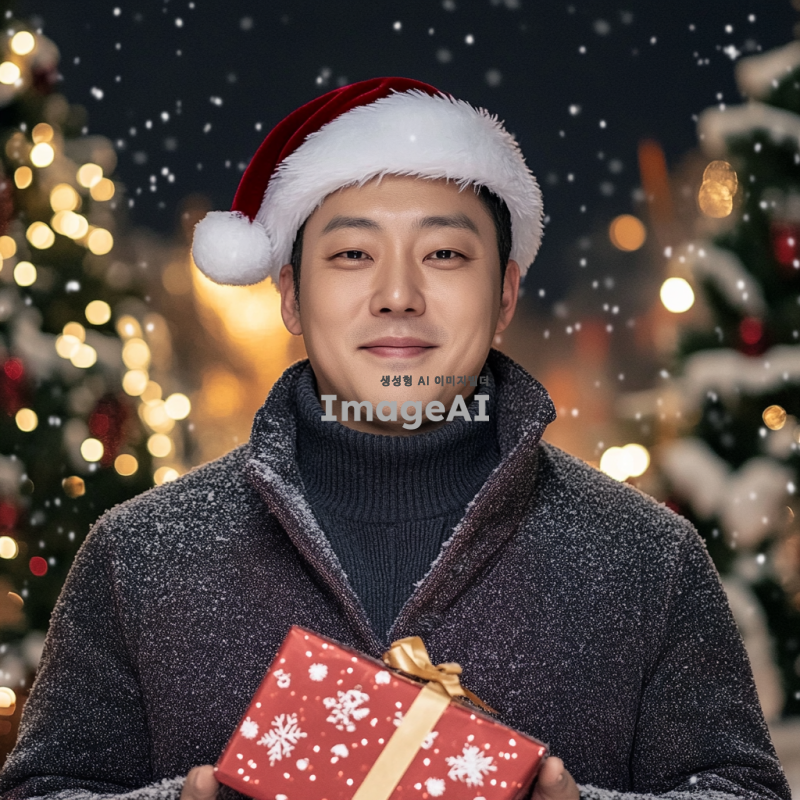 크리스마스 분위기의 배경에 산타 모자를 쓴 한국인 남성, 밝고 따뜻한 미소를 지으며 눈이 내리는 겨울 풍경 속에서 선물을 들고 있는 모습, 붉은색과 흰색의 전통적인 산타 의상을 입고 있으며 주변에는 크리스마스 트리와 반짝이는 조명들이 장식되어 있는 장면.