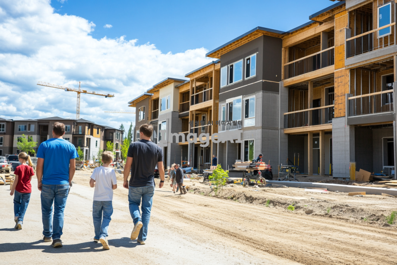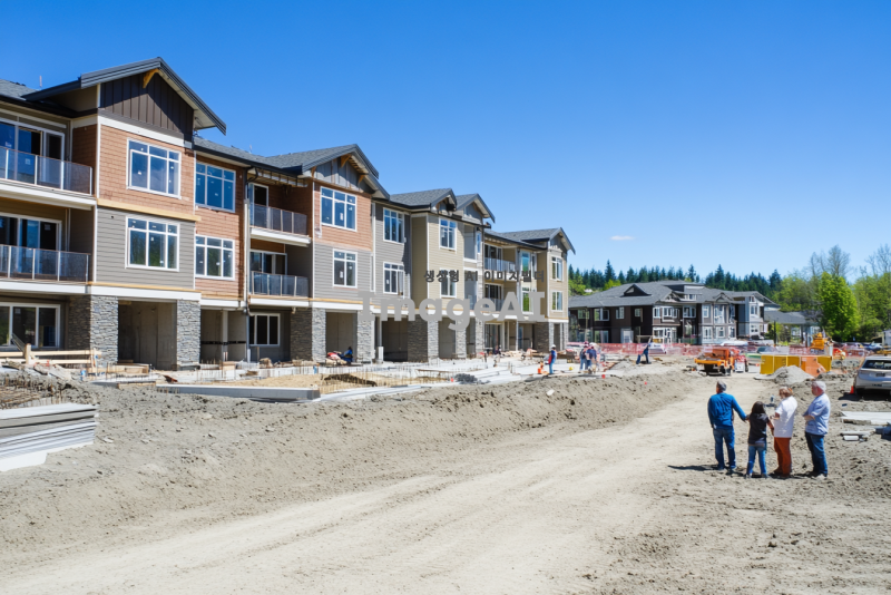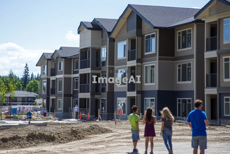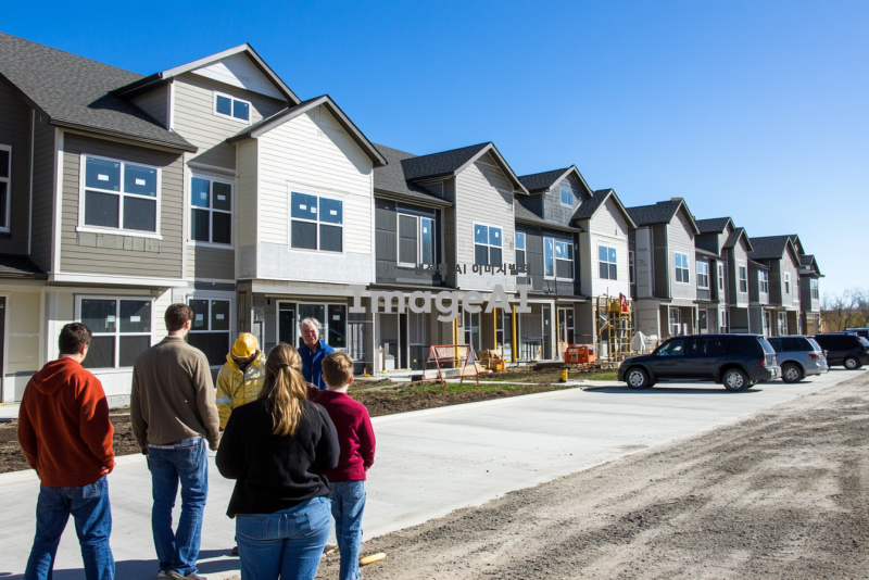 완공이 거의 다 된 현대적인 아파트 건설 현장, 예비 입주민들이 사전점검을 위해 현장을 방문하고 있는 모습. 다양한 연령대의 가족단위의 사람들이 아파트 외관과 내부를 꼼꼼히 살펴보고 있다. 배경에는 아파트 주차장에서 사전점검 행사를 하고있는 모습