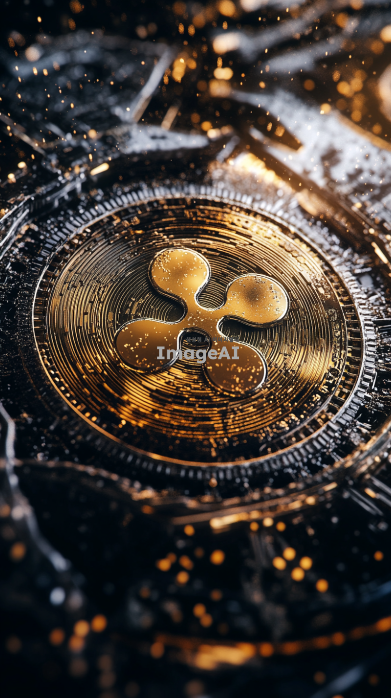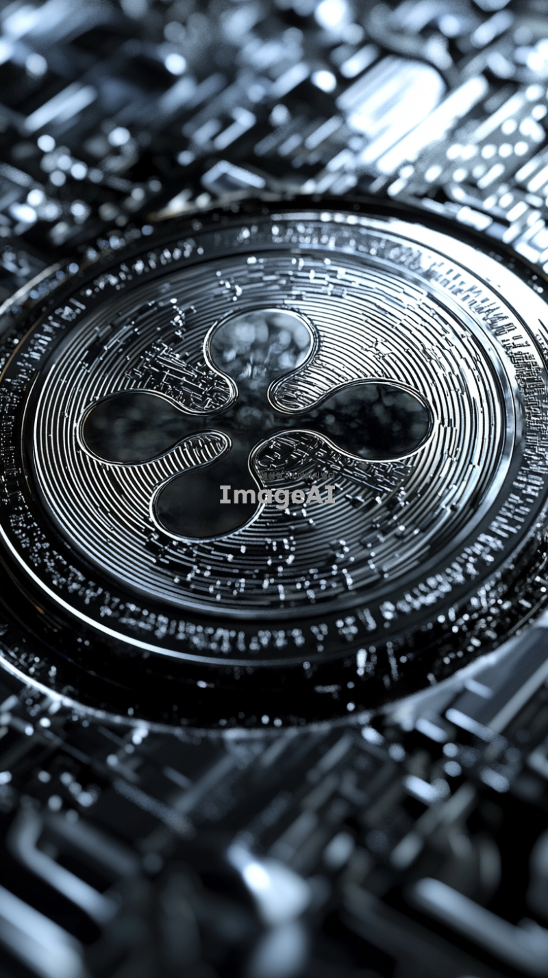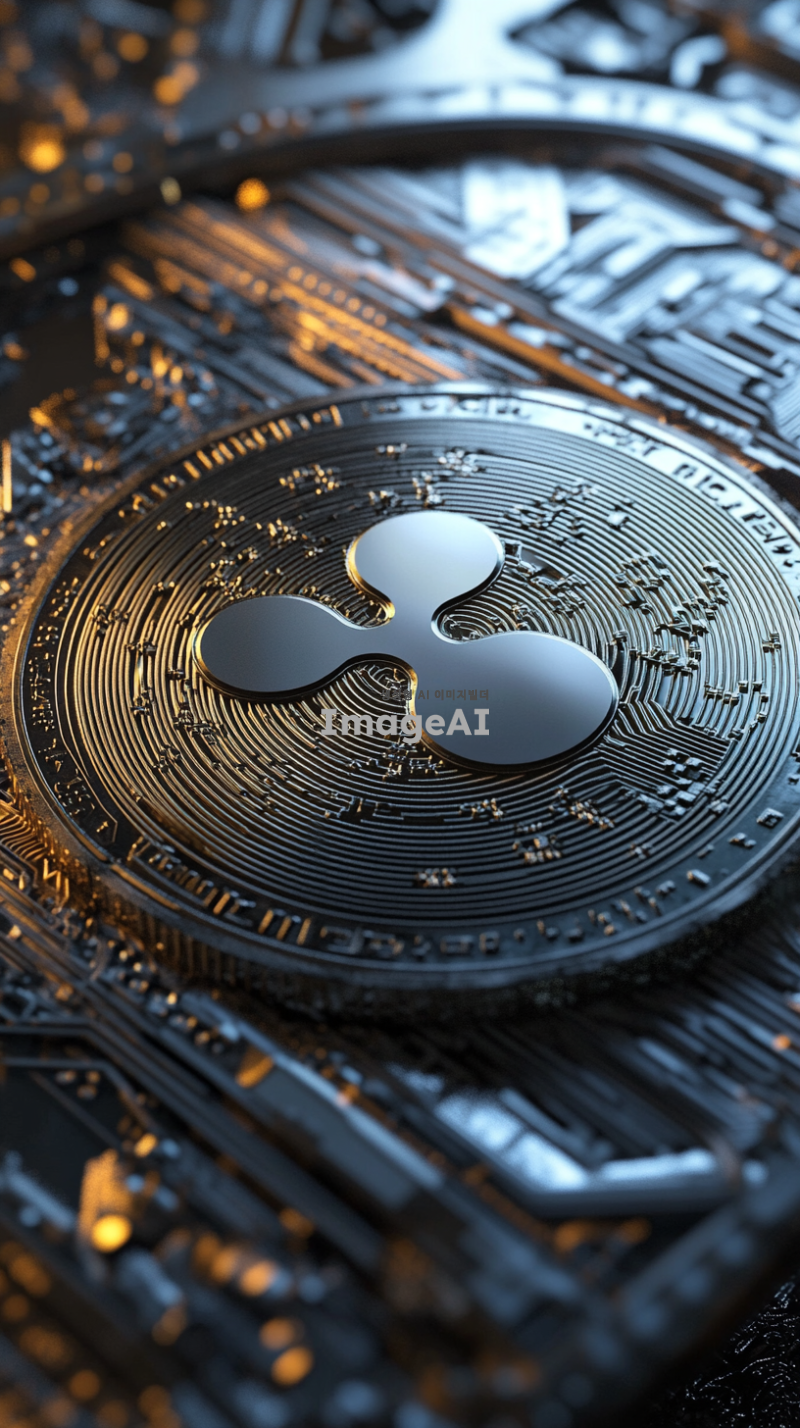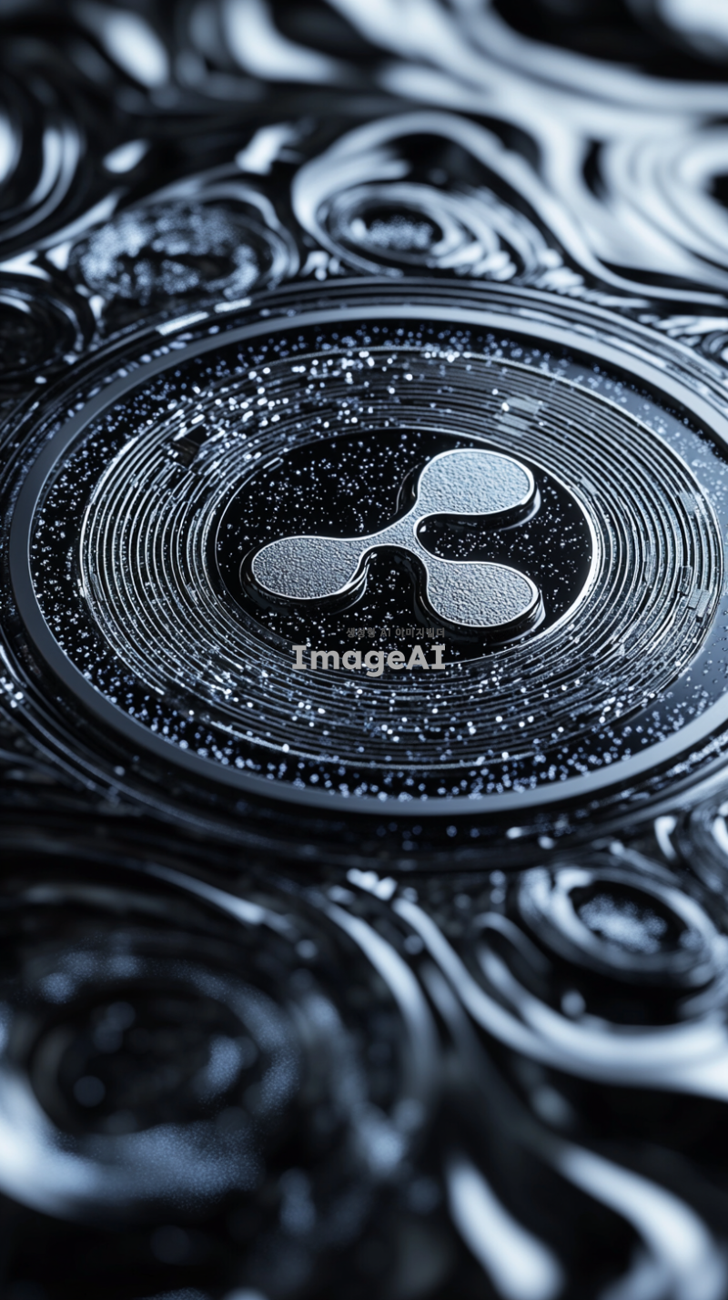 리플 코인의 로고가 중앙에 크게 위치한 이미지, 배경은블랙와 실버 톤의 추상적인 패턴으로 구성, 코인의 표면은 빛을 반사하여 반짝이는 효과, 디지털 화폐의 미래지향적인 느낌을 강조하는 디자인, 고급스럽고 현대적인 분위기, 코인의 가장자리는 부드럽게 빛나도록 표현.