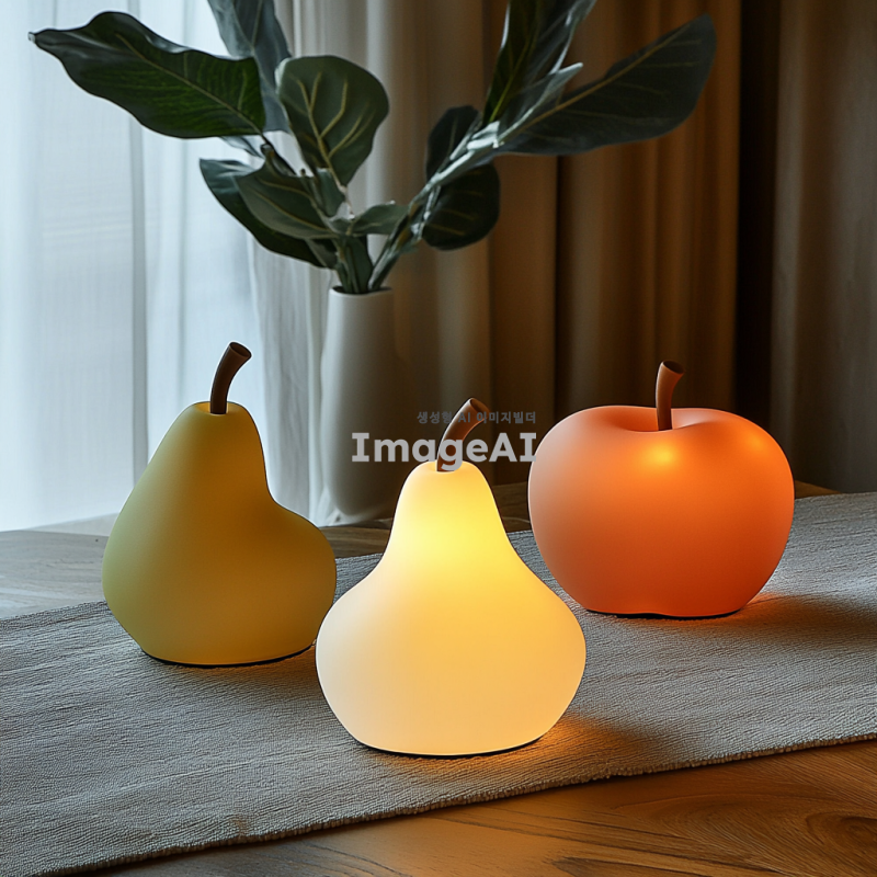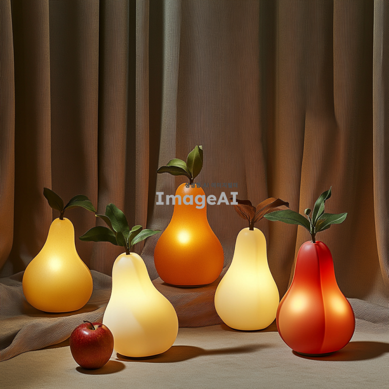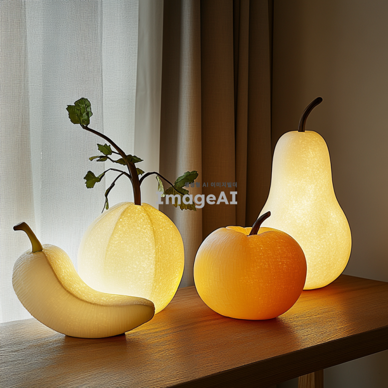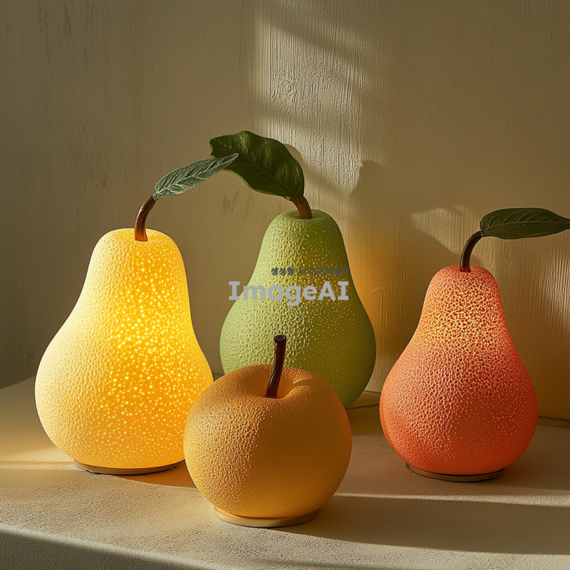과일 모양의 스탠드 조명, 부드러운 곡선과 자연스러운 색감, 따뜻한 빛을 발산하는 디자인, 사과, 배, 오렌지, 바나나 등 다양한 과일 형태, 현대적이고 세련된 느낌, 고급스러운 재질감, 실내 인테리어에 잘 어울리는 스타일, 과일의 질감과 디테일을 살린 디자인, 조명과 과일의 조화로운 조합, 심플하면서도 독특한 매력, 주변 공간을 환하게 밝혀주는 기능성.
