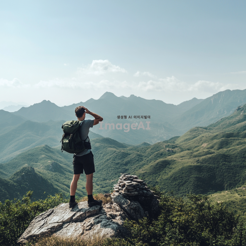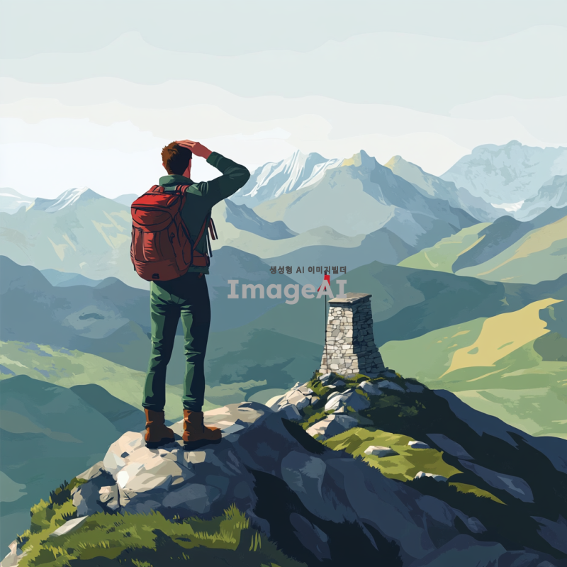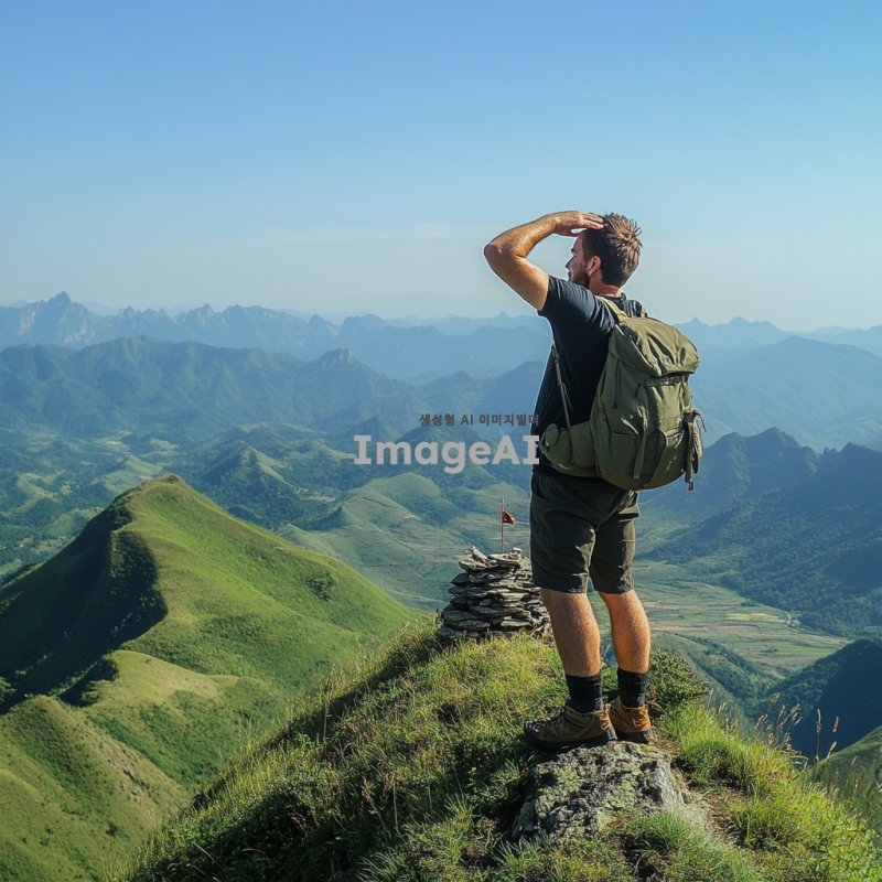 맑은 하늘 아래 산 정상에 서 있는 등산객 아저씨, 땀에 젖은 얼굴에 성취감이 가득하며, 등산복과 등산화를 착용하고 있고, 주변에는 푸른 산과 드넓은 풍경이 펼쳐져 있다. 아저씨는 손을 이마에 얹고 멀리 바라보며, 가벼운 바람에 머리카락이 흩날리고 있다. 산 정상에는 작은 돌탑과 깃발이 있으며, 자연의 웅장함을 느낄 수 있는 장면.