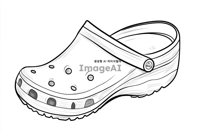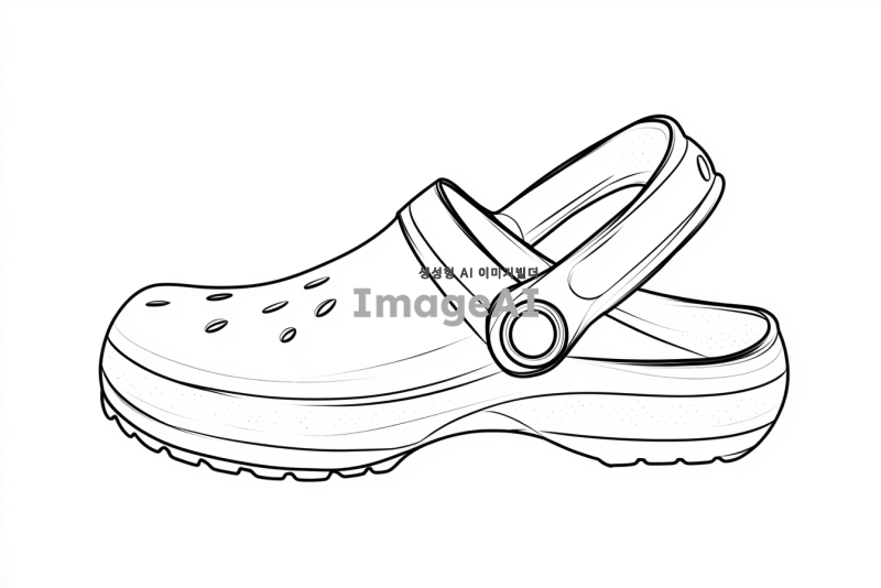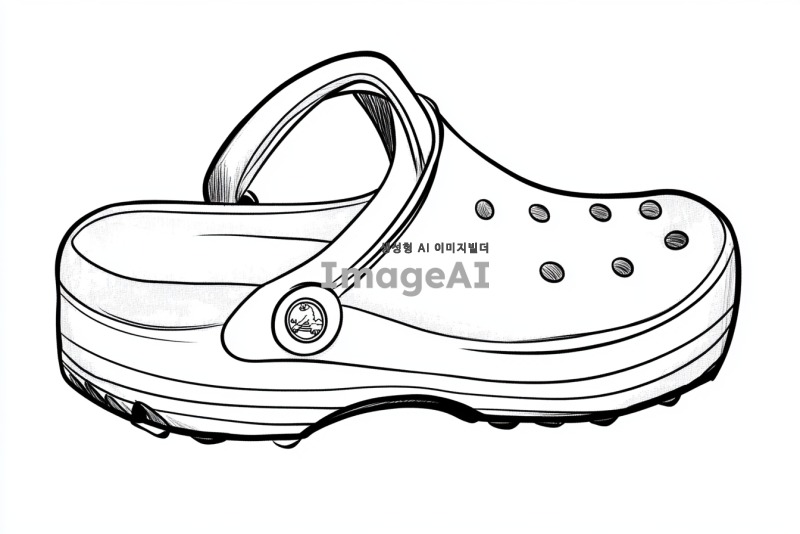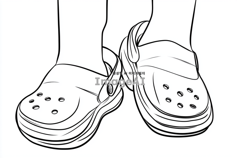 크록스를 신고 걷는 심플한 캐릭터 스타일의 발, 흑백 선화, 디테일 없이 간결한 선으로만 표현, 배경 없음.