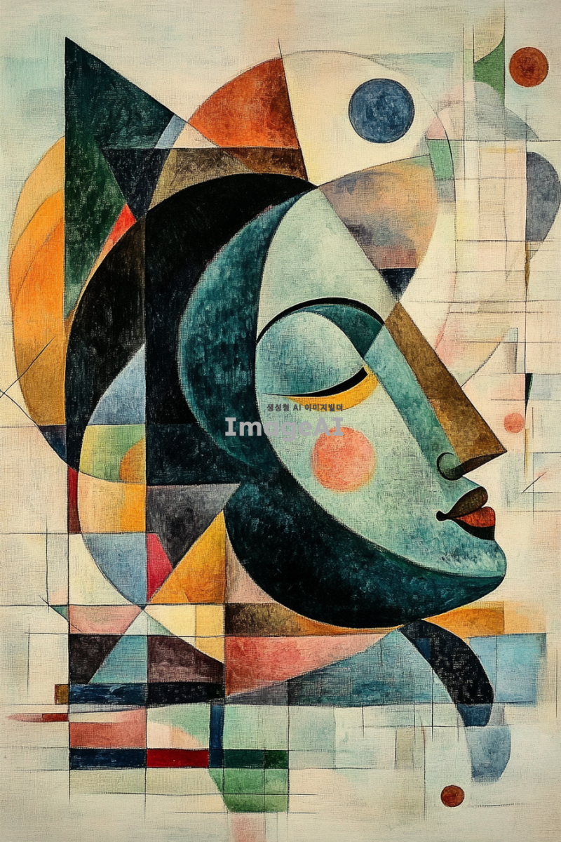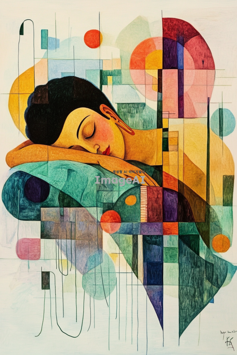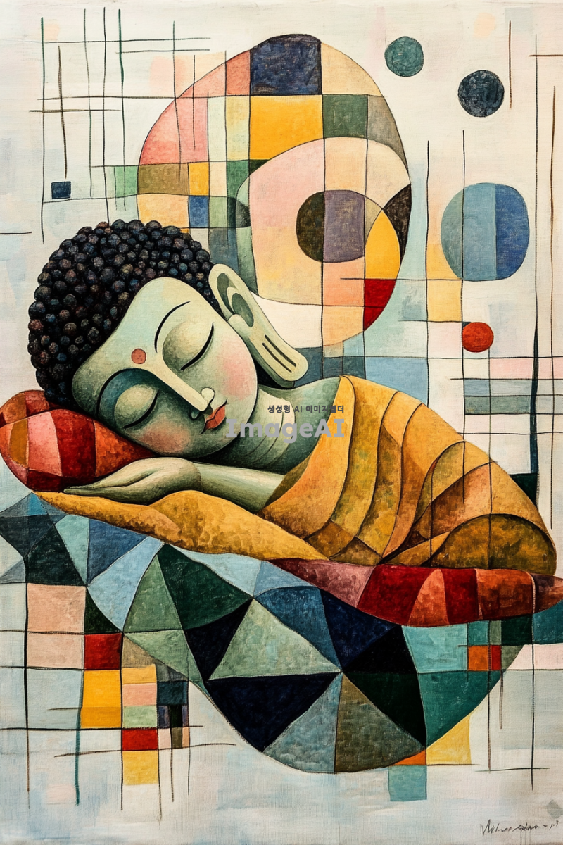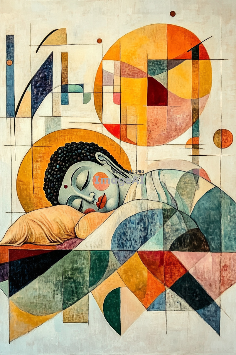 와불이 이불을 덮고 낮잠을 자고 있는 모습을 중심으로, 배경은 삼각형, 사각형, 기다란 선 등의 단순한 도형들이 조화롭게 떠다니는 추상 이미지. 도형들은 전체적으로 균형을 이루며, 녹색과 핑크색과 파란색 계열의 색상을 사용하여 표현. 녹색은 밝은 색이지만 채도가 낮은 색. 파란색은 울트라마린 색. 핑크색은 형광빛이 나는 색으로. 부드럽고 조형적인 추상 배경이 강조된 이미지. 칸딘스키의 추상작업을 참고하여. 와불과 이불은 사실적인 묘사로 표현하고 뒷배경인 추상작업은 단순한 이미지로. 이불을 덮고 있는 와불이 그림의 주제이지만 화면의 상단에 위치.