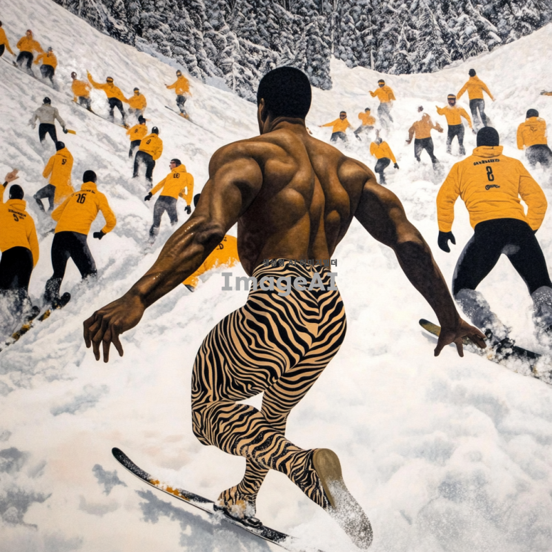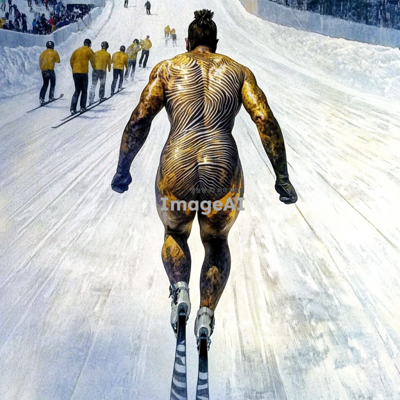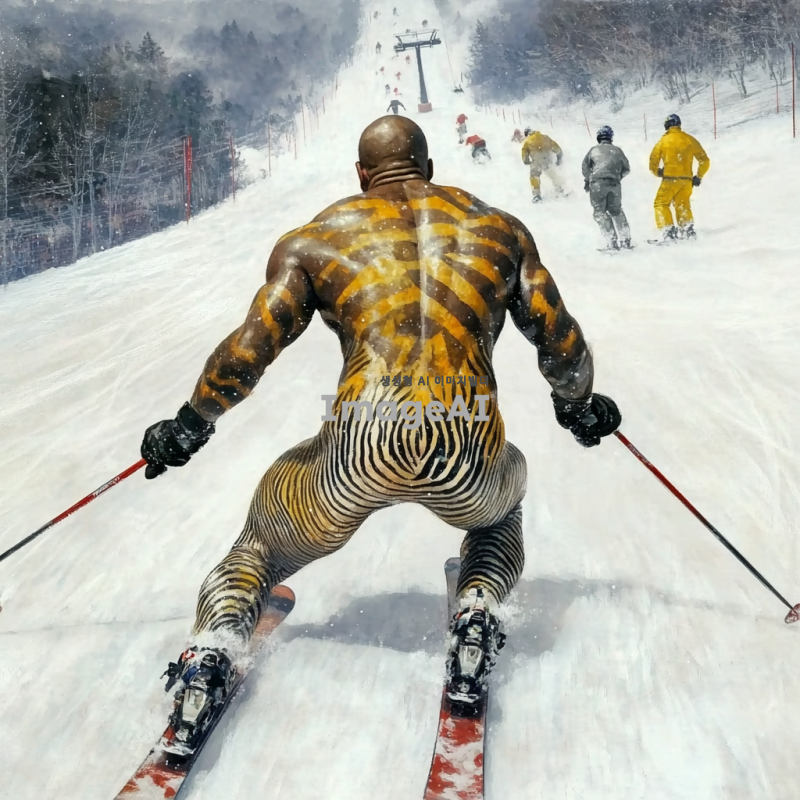 구릿빛 피부의 근육질 남성이 얼룩말 무늬 옷을 입고 스키장에서 빠르게 내려가고 있다. 그의 뒷모습이 보이며, 스키를 타는 모습이 역동적이다. 배경에는 노란색과 회색이 섞인 자켓을 입은 남성들이 그를 쫓고 있으며, 그들의 모습이 긴박하게 표현된다. 주변은 하얀 눈으로 덮인 스키장의 풍경이 펼쳐져 있다.