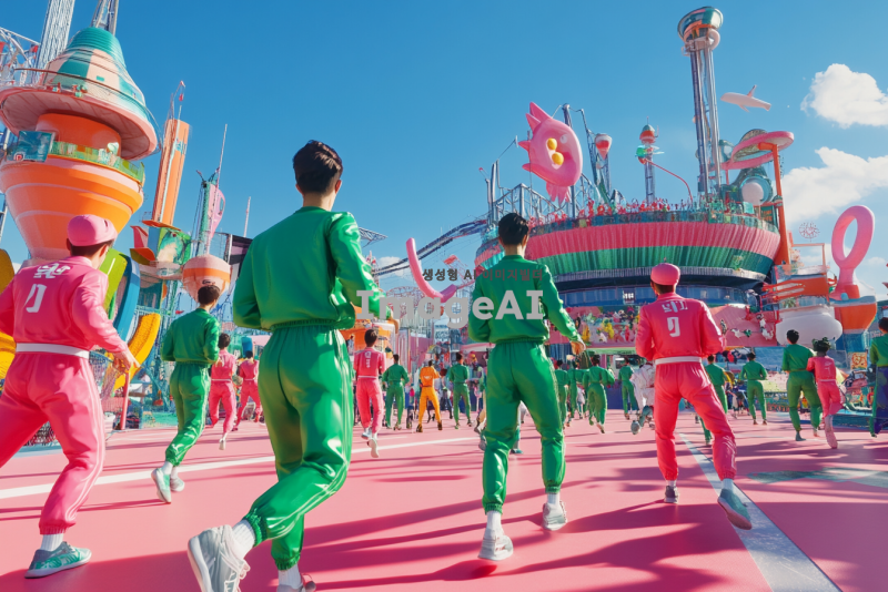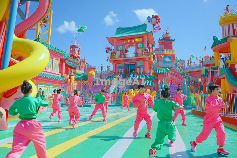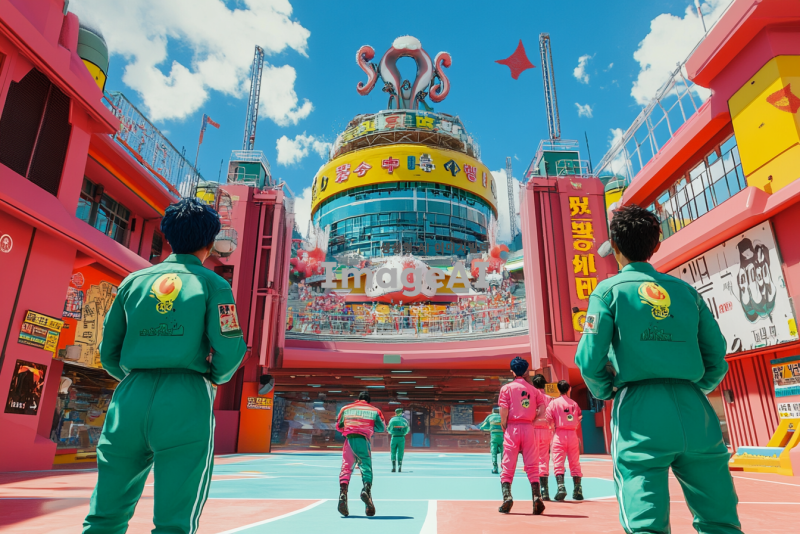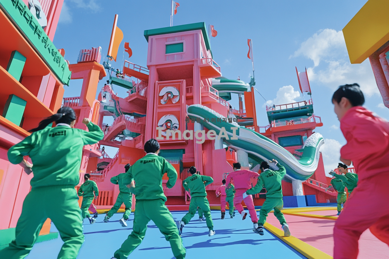 오징어게임 테마의 장면, 초록색 운동복을 입은 참가자들이 핑크색과 빨간색 유니폼을 입은 경비원들과 함께 게임을 진행하는 모습, 배경에는 파란색 하늘과 게임장의 독특한 구조물이 보이는 장면, 생동감 있고 밝은 색감으로 표현, 한국 전통 놀이를 상징하는 요소들이 추가된 이미지.