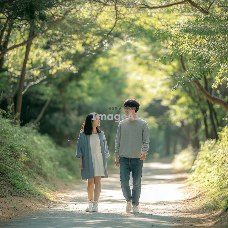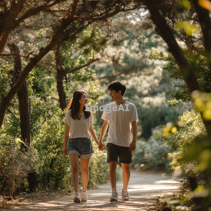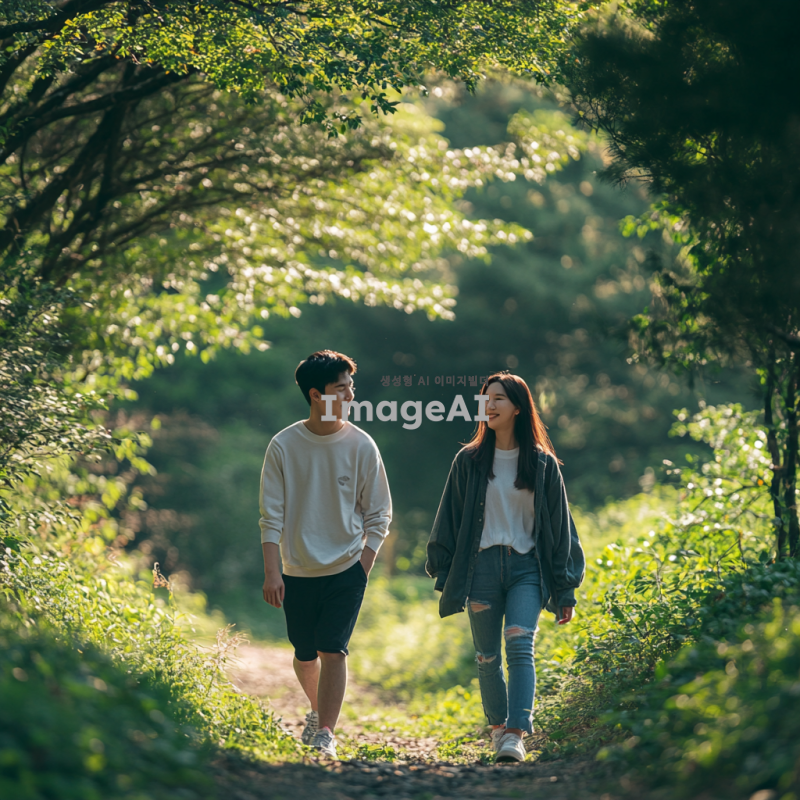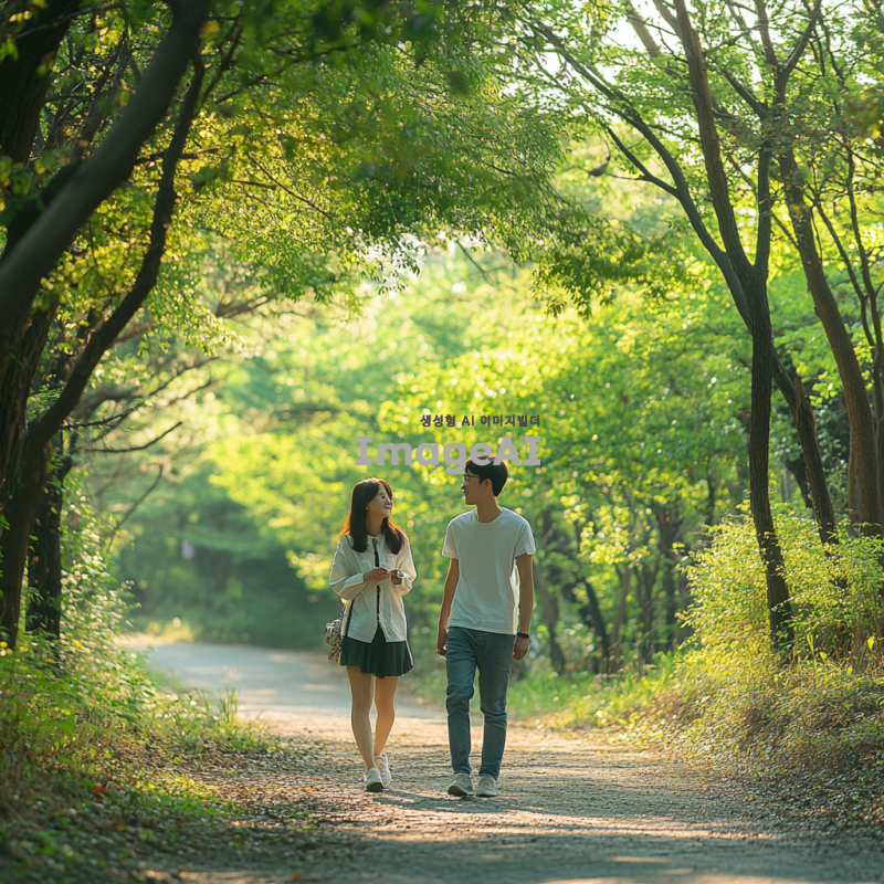 푸른 숲 속의 오솔길을 따라 천천히 걸어가는 젊은 한국인 남성과 여성이 있는 장면. 그들은 자연을 즐기며 여유롭게 대화를 나누고 있다. 주변에는 푸른 나무들과 부드러운 햇살이 비치고, 새들이 지저귀며 평화로운 분위기를 연출한다. 남성과 여성은 캐주얼한 옷차림을 하고 있으며, 편안한 미소를 짓고 있다. 느린 걸음걸이가 강조되도록 표현하고, 그들의 뒤로는 끝없이 펼쳐진 숲의 경치가 보인다.