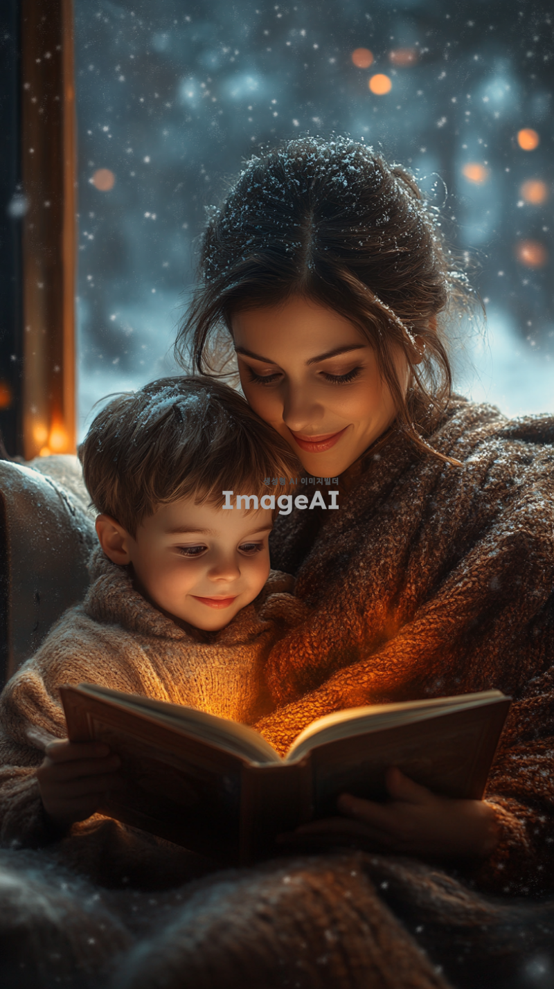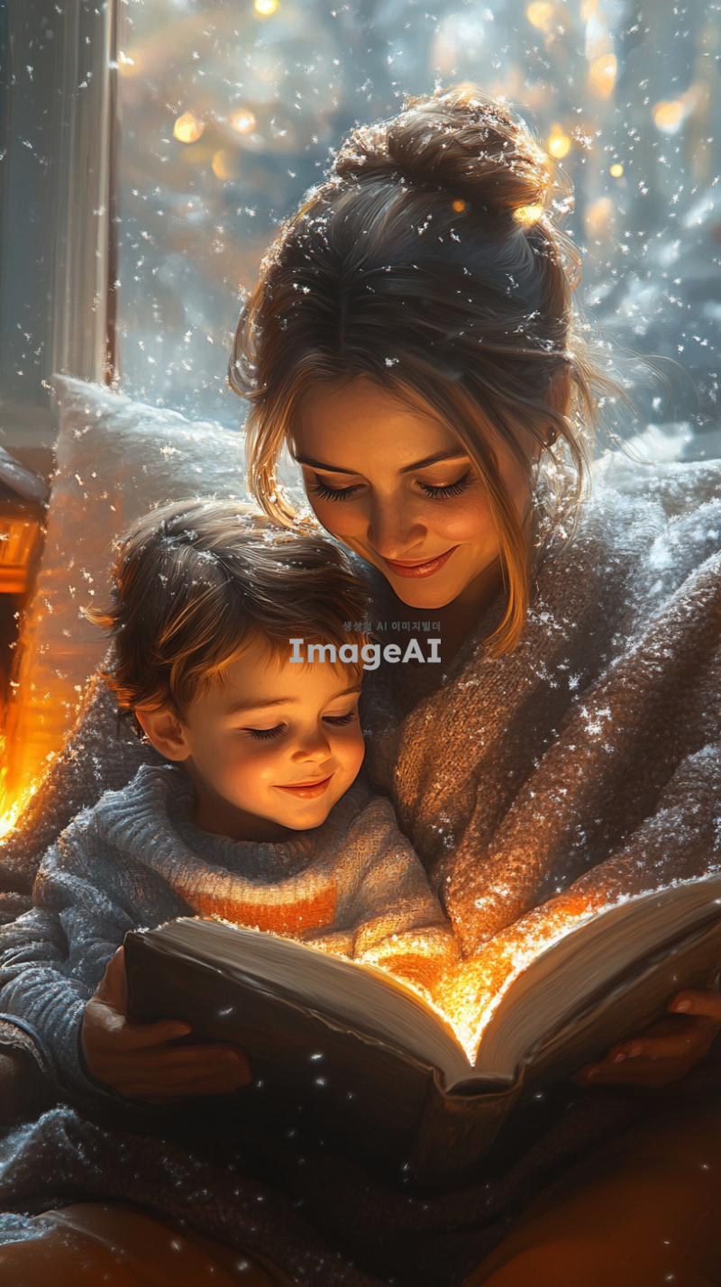 추운 겨울날, 따뜻한 실내에서 엄마와 자녀가 함께 담요를 덮고 소파에 앉아 있는 모습. 엄마는 자녀에게 책을 읽어주고 있으며, 창문 밖으로는 눈이 내리고 있는 풍경. 방 안은 아늑하고 따뜻한 조명으로 밝혀져 있고, 벽난로가 불타고 있는 장면. 자녀는 엄마에게 기대어 행복한 미소를 짓고 있는 모습.