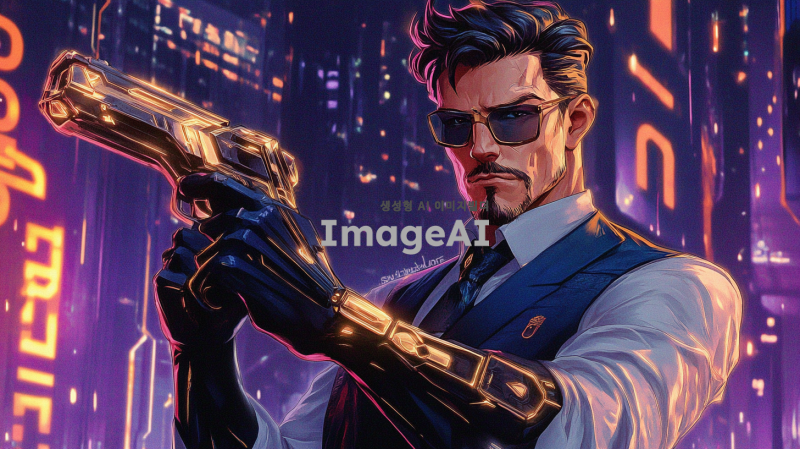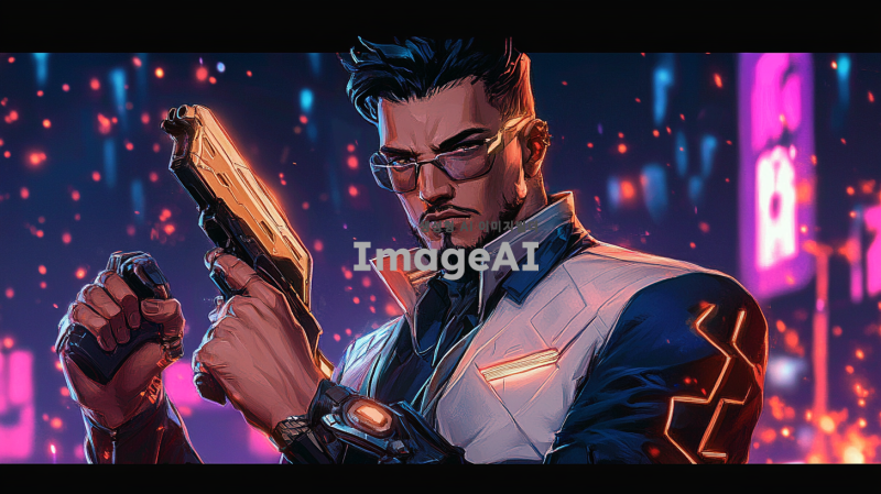 체임버가 발로란트 오퍼레이터를 양손으로 들고 있는 모습, 배경은 현대적인 도시의 야경, 체임버의 복장은 그의 시그니처 슈트 스타일, 주변에 네온 불빛이 반짝이는 분위기, 체임버의 표정은 자신감 있고 집중된 모습, 디테일한 그림체, 현실적이면서도 약간의 스타일리시한 터치., 만화같은 스타일