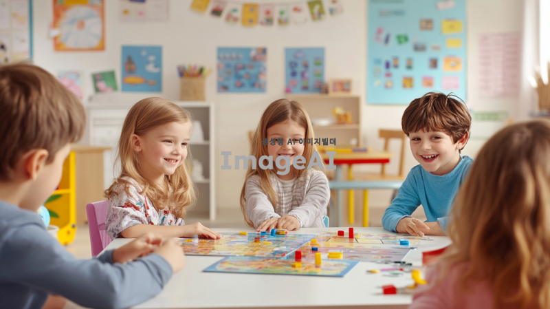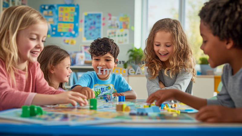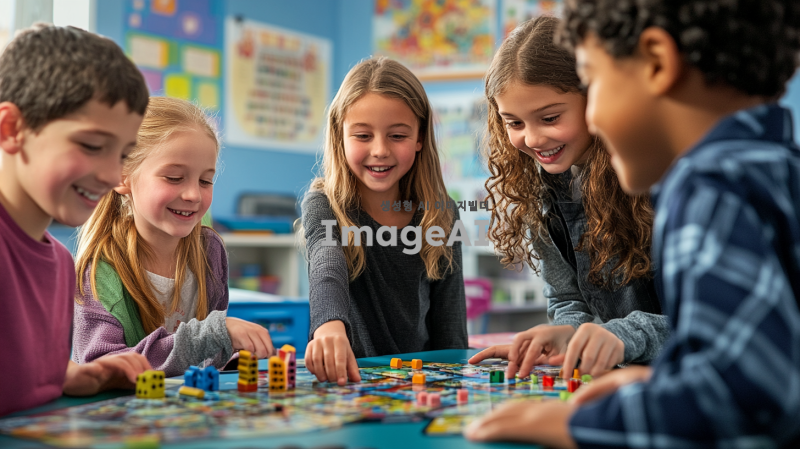 밝고 활기찬 분위기의 교실에서 아이들이 스플랜더 보드게임을 활용한 수학 놀이 활동을 하고 있는 장면. 다양한 나이대의 아이들이 함께 모여 게임을 즐기며 웃고 있는 모습. 교실 벽에는 수학 관련 포스터와 장식들이 걸려 있고, 테이블 위에는 스플랜더 게임 구성품들이 잘 정리되어 있는 모습. 창의적이고 즐거운 학습 환경을 강조하는 이미지. 배경은 깔끔하고 따뜻한 색감으로 표현.
