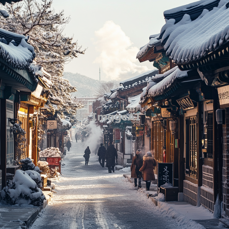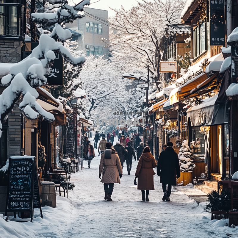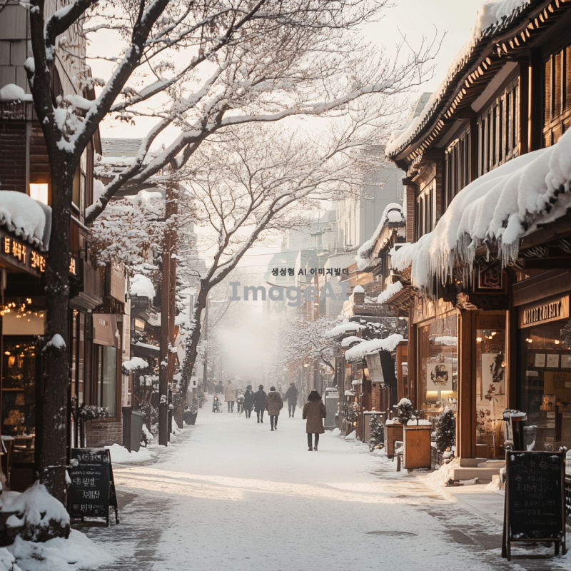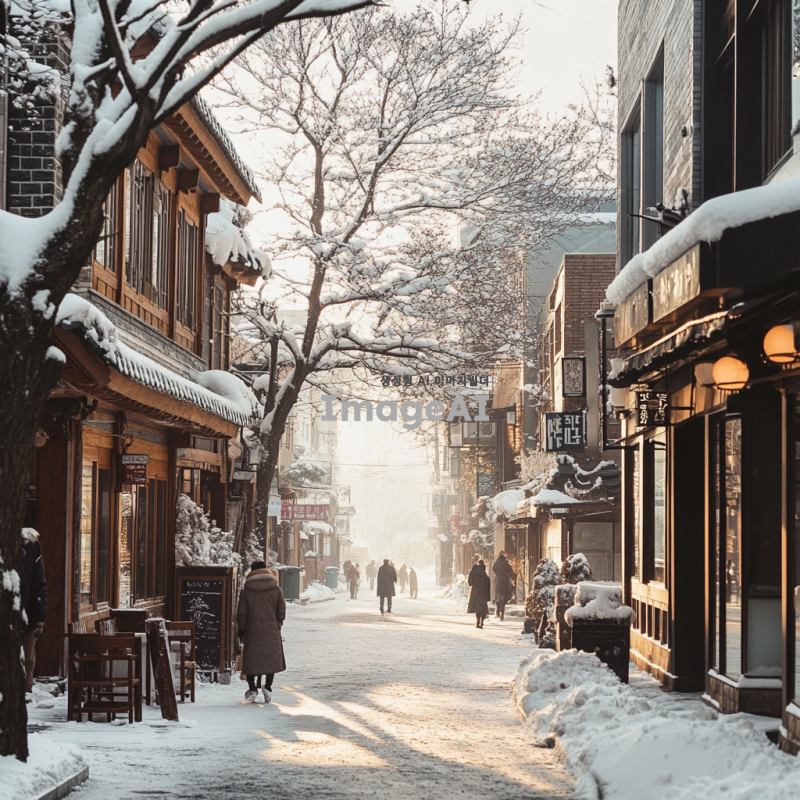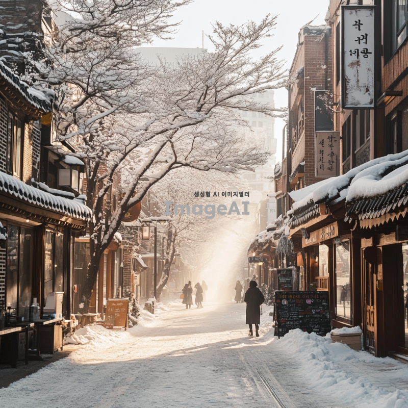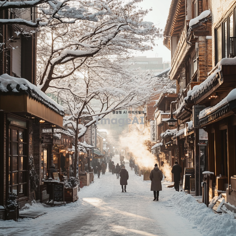 한국의 겨울 도시 풍경, 눈이 소복이 쌓인 거리, 따뜻한 불빛이 새어 나오는 창문, 눈 덮인 나무들, 겨울철 코트를 입고 걸어가는 사람들, 전통 한옥과 현대적인 건물이 조화를 이루는 모습, 차가운 공기를 표현한 맑은 하늘, 거리의 작은 카페에서 나오는 김, 포근하고 평화로운 분위기