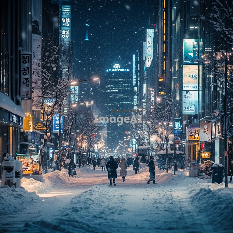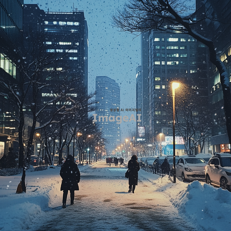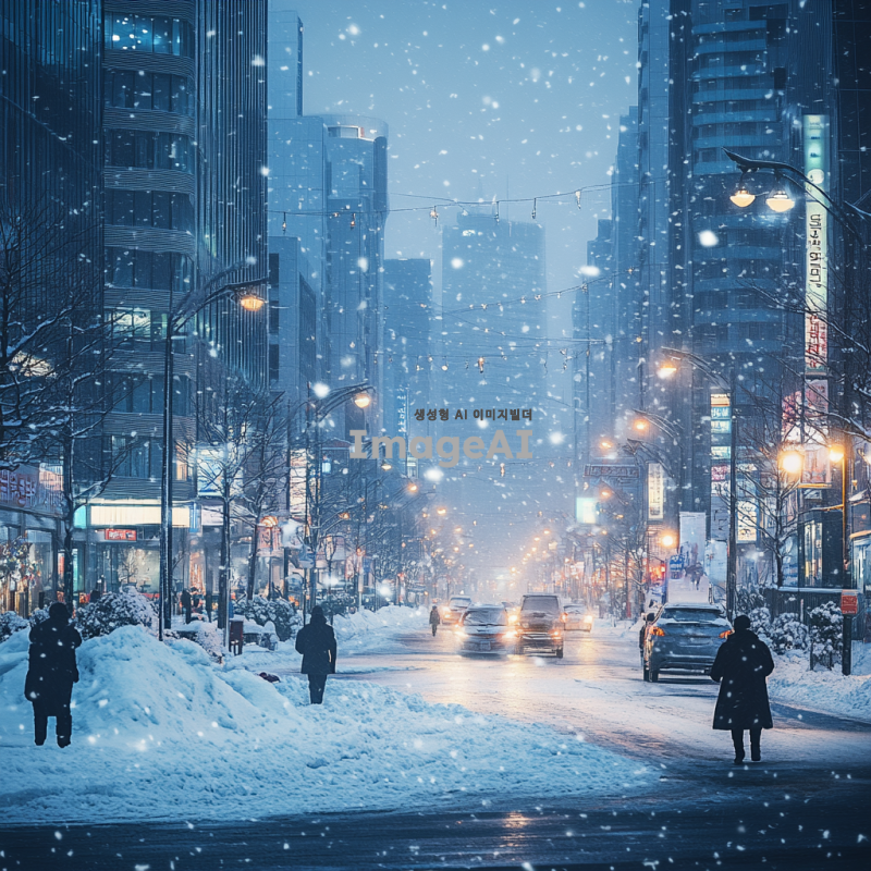 겨울철 눈이 내리는 한국의 도시 풍경, 고층 빌딩과 도로 위에 소복이 쌓인 눈, 거리의 가로등이 부드럽게 빛나고 있는 모습, 사람들이 따뜻한 옷을 입고 거리를 걷고 있는 장면, 포근하고 조용한 분위기, 하늘에서 내리는 눈송이가 공중에서 반짝이는 모습, 도시의 현대적이면서도 아늑한 느낌.