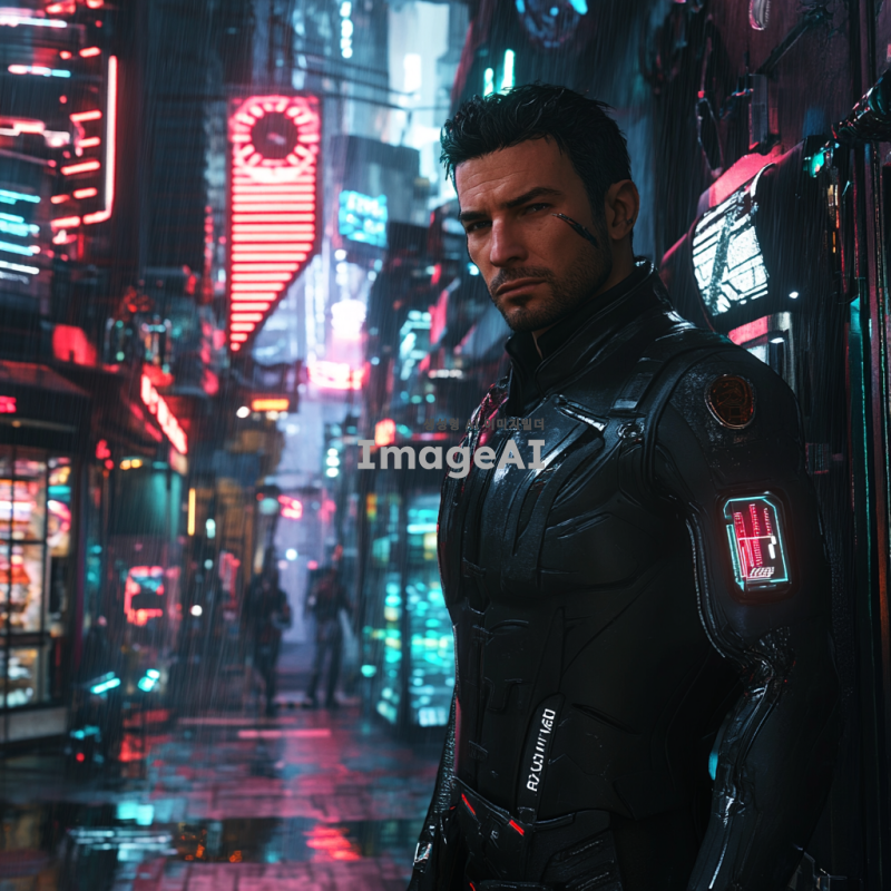 미래 도시 배경, 네온 간판이 멀리 보이는 장면, 폐쇄된 연구소 앞에 블랙 슈트를 입은 도시 영웅이 서 있다. 팔에는 갤럭시워치를 착용하고 있으며, 도시 영웅은 날카롭고 결단력 있는 표정을 짓고 있다. 연구소는 첨단 기술로 둘러싸여 있으며, 주변에는 약간의 긴장감이 흐른다.
