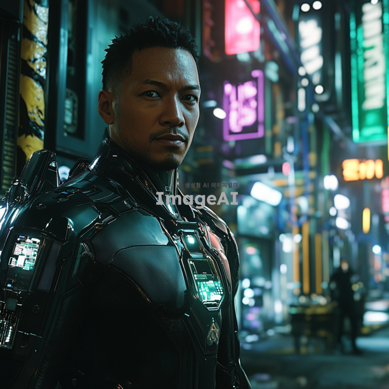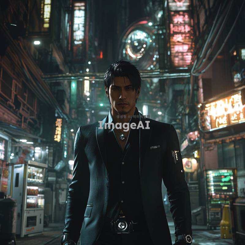 해킹으로 폐쇄된 연구소 앞에 블랙 슈트를 입은 도시 영웅이 서 있고 팔에는 갤럭시워치를 차고 있어. 배경은 미래도시 적인 느낌인데 네온 간판들이 멀리 눈에 띄기도 해
