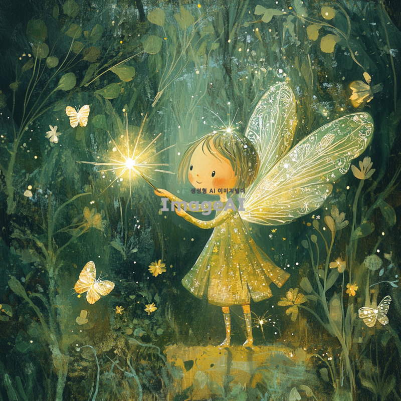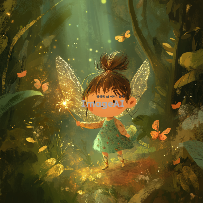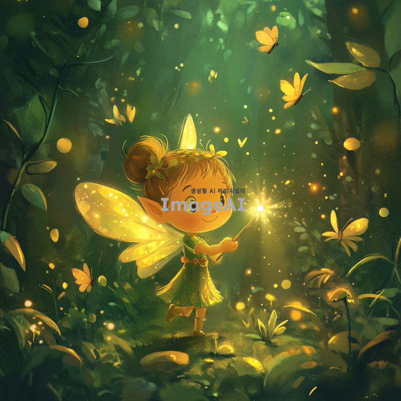 환상적인 숲 속에서 작은 날개를 가진 요정이 반짝이는 마법 지팡이를 들고 있는 모습. 요정은 밝고 따뜻한 미소를 지으며, 주변에는 은은한 빛이 감도는 신비로운 분위기. 요정의 옷은 자연에서 영감을 받은 초록색과 금색으로 장식되어 있으며, 주변에는 작은 꽃잎과 나비들이 함께 어우러져 있는 장면. 요정의 손짓에 따라 사라지는 실수의 흔적들이 마치 마법처럼 사라지는 모습.