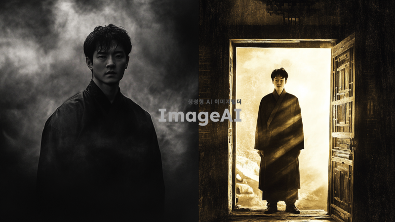 좌측에는 흐린 날씨 속에서 우울한 표정을 짓고 있는 한국인 남성이 서 있는 장면. 그의 주변은 어두운 색조로 표현되어 있으며, 고개를 약간 숙이고 있다. 중앙에는 밝은 빛이 새어 나오는 문이 있고, 문을 통과한 후 우측에는 맑은 날씨 속에서 밝고 활기찬 표정을 짓고 있는 한국인 남성이 서 있다. 그의 주변은 밝고 따뜻한 색조로 표현되어 있으며, 미소를 짓고 고개를 들고 있다. 문을 경계로 좌우의 분위기가 극명하게 대비되는 장면.