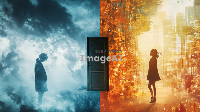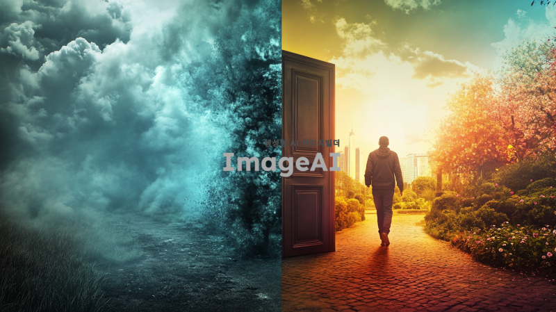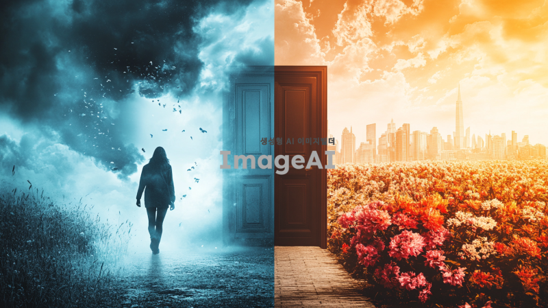 좌측에는 흐린 날씨와 어두운 색조의 배경, 고개를 숙이고 있는 사람 한 명이 있습니다. 우울한 분위기를 나타내기 위해 회색과 파란색의 조합을 사용합니다. 가운데에는 문이 있으며, 문을 통과한 후 우측에는 밝은 햇살과 따뜻한 색조의 배경, 미소를 지으며 활기차게 걷고 있는 사람이 있습니다. 우측 배경은 꽃이 만발한 정원이나 밝은 도시 풍경으로 설정합니다.