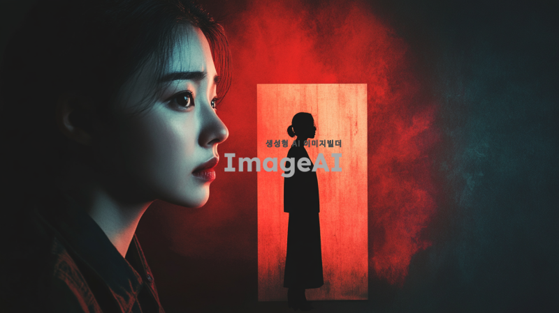 어두운 배경의 왼쪽에서 우울한 표정을 짓고 있는 한국인, 중앙에 문이 위치, 문을 기준으로 오른쪽은 밝고 활기찬 배경, 오른쪽에는 생기가 넘치는 표정의 한국인.