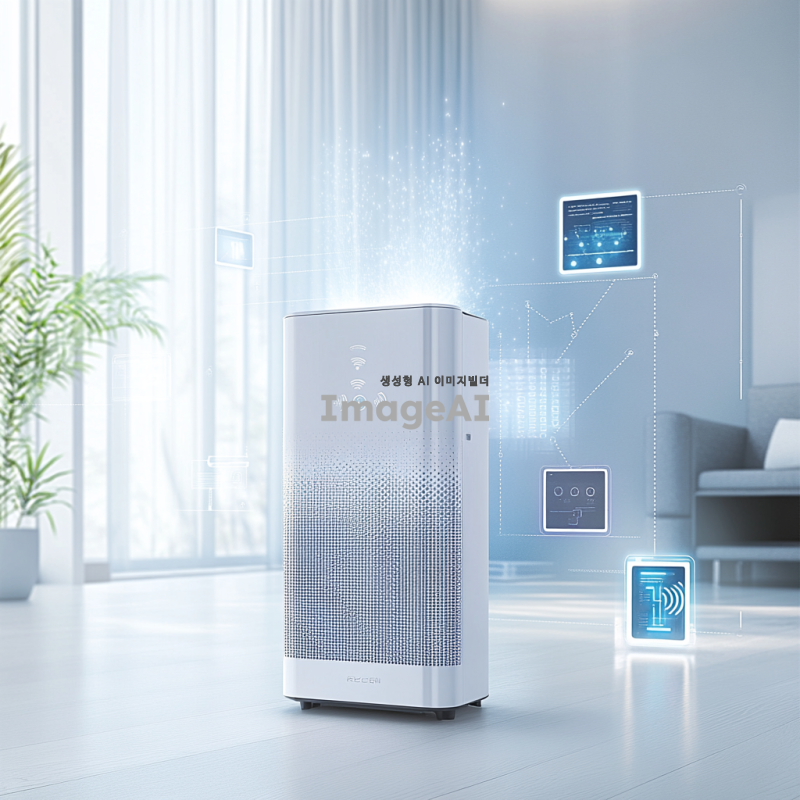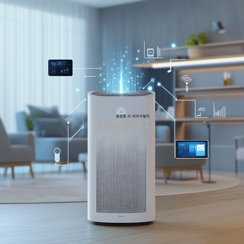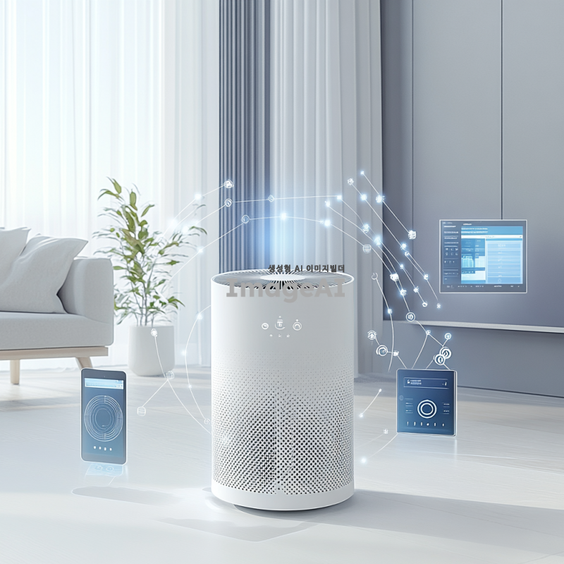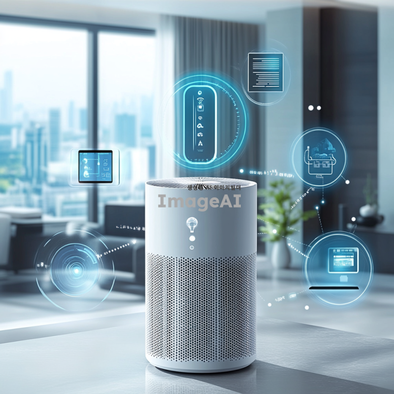 현대적인 디자인의 스마트 공기청정기가 방 안에 놓여 있으며, 주변에 IoT 기기들이 연결되어 있는 모습을 보여줍니다. 공기청정기에서 전기 먼지화 기술이 작동하여 먼지를 효율적으로 제거하는 장면을 시각적으로 표현합니다. 전력 소비가 절감되는 모습을 나타내기 위해 공기청정기와 IoT 기기들 사이에 에너지 흐름을 나타내는 그래픽 요소를 추가합니다. 스마트 전력 관리 시스템이 불필요한 에너지 소비를 방지하는 장면을 강조하기 위해, 디지털 인터페이스에서 에너지 절약 모드가 활성화된 화면을 보여줍니다. 전체적으로 깨끗하고 효율적인 이미지를 위해 밝고 선명한 색감을 사용하고, 기술적이고 미래지향적인 느낌을 살리는 디자인 요소를 포함합니다.