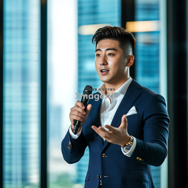 Prompt: Korean male presenter, stylish and clean business hairstyle, mid-presentation in a modern conference room, glass walls, cityscape visible outside, wearing a tailored navy suit, confident posture, holding a microphone, dynamic hand gestures, photorealistic, vibrant lighting, corporate professional mood