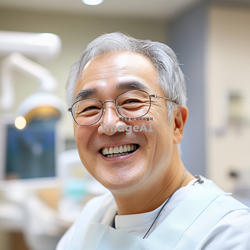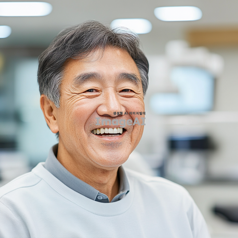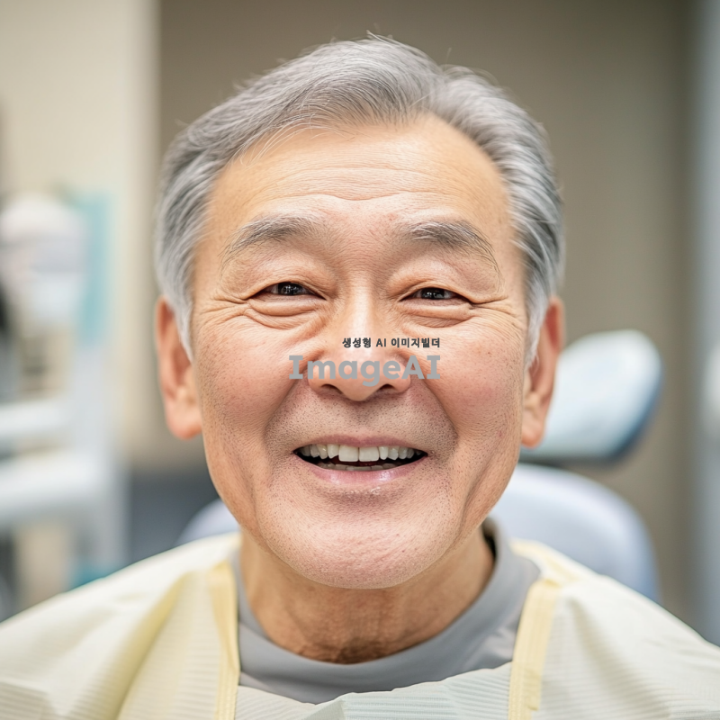 60대 한국인 노인이 치과 치료를 받고 만족스럽게 웃고 있는 모습, 밝고 편안한 분위기, 치과 내부 배경, 환한 조명, 환자의 얼굴에 기쁨과 안도감이 드러나는 표정, 깨끗하고 전문적인 치과 환경, 건강한 치아가 강조된 미소.