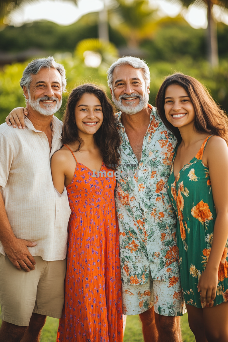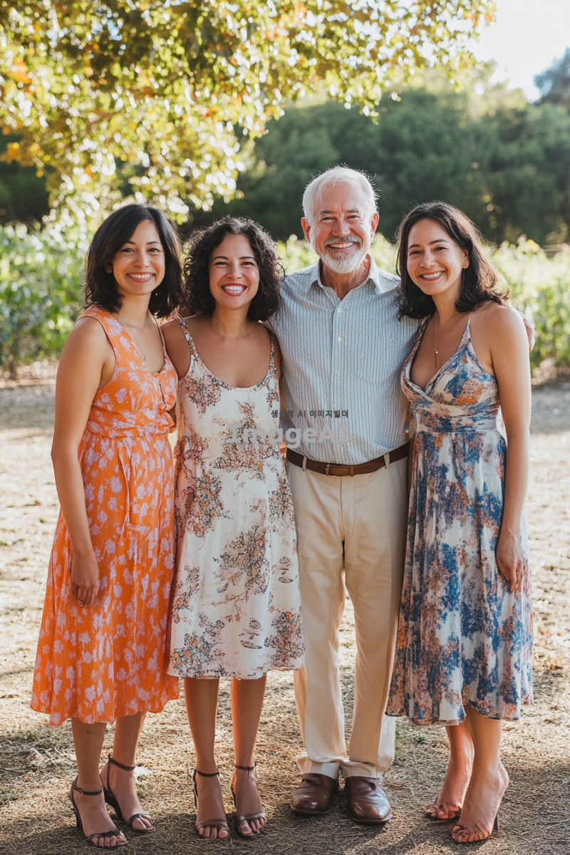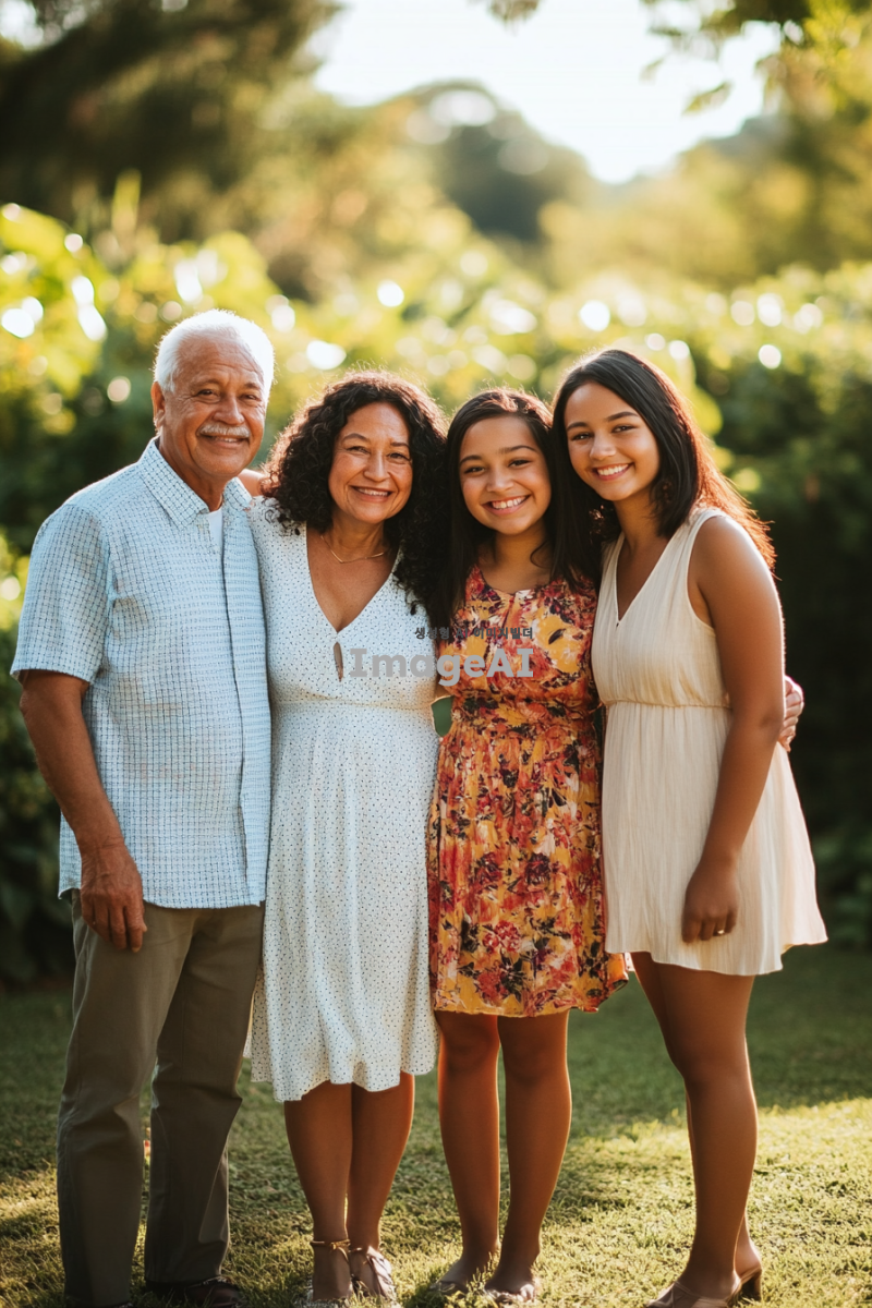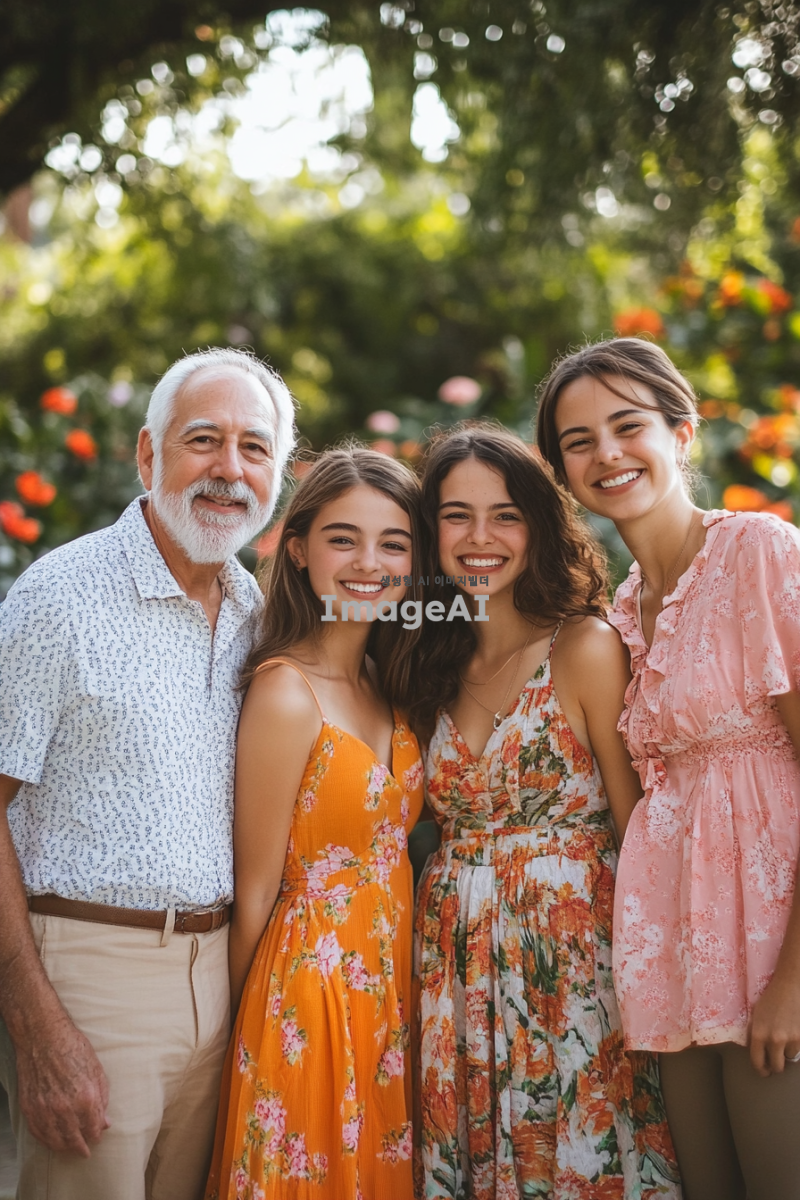 50대 부모님과 20대 두 딸이 함께 서 있는 가족사진. 모두가 환하게 웃고 있는 모습. 부모님은 서로 어깨를 감싸고, 딸들은 부모님 옆에 서서 손을 잡고 있는 포즈. 배경은 따뜻한 분위기의 공원이나 정원으로 설정. 밝고 화사한 색감의 옷을 입고 있는 가족 구성원들. 자연스러운 조명과 함께 가족의 사랑과 행복이 느껴지는 장면.