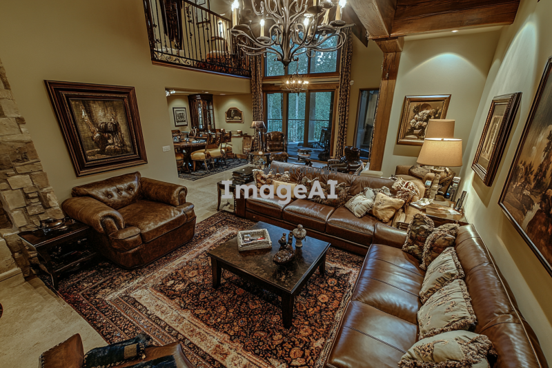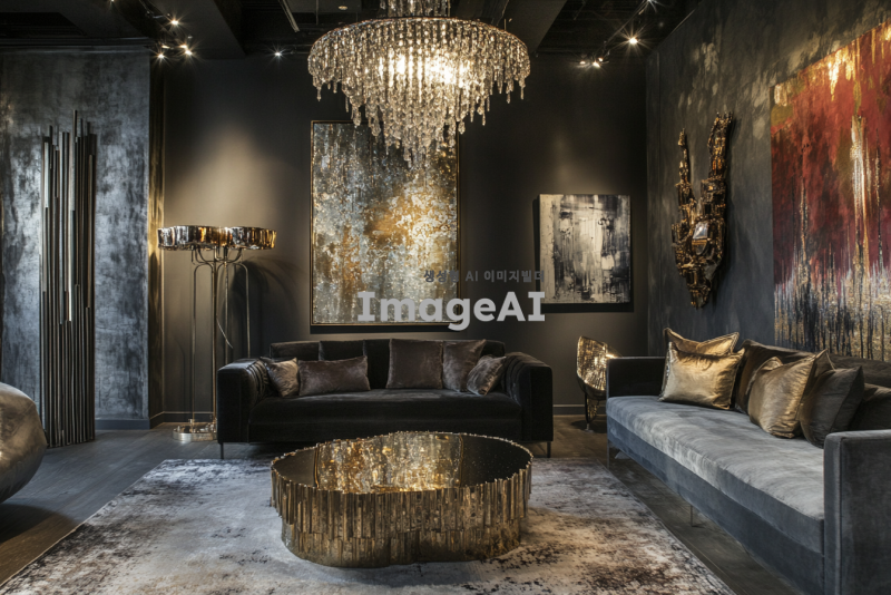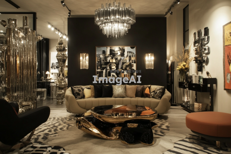 아늑하고 작은 거실, 화려한 샹들리에가 중앙에 걸려 있고, 고급스러운 명품 가구와 장식품들로 채워진 공간, 부드러운 조명 아래 반짝이는 금속과 유리 디테일, 벽에는 예술 작품이 걸려 있으며, 고급스러운 카펫이 깔려 있는 장면.