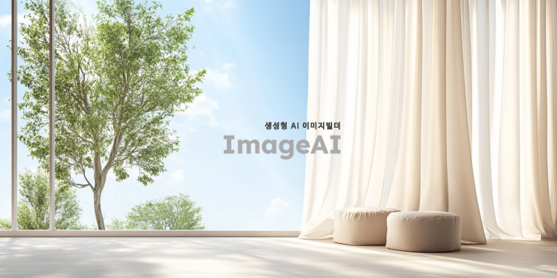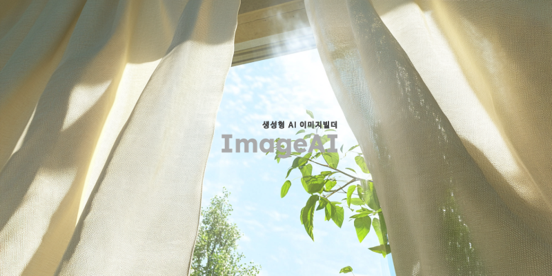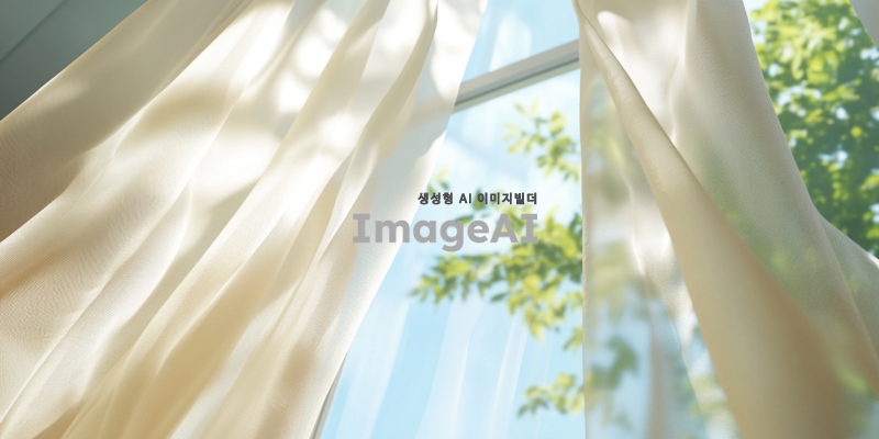 아이보리색 커튼이 드리워진 창가, 부드러운 햇살이 커튼을 통해 방 안으로 들어오는 장면, 커튼의 섬세한 주름과 텍스처가 강조된 모습, 창 밖으로 보이는 푸른 하늘과 초록 나무들, 따뜻하고 아늑한 분위기, 자연광이 실내를 부드럽게 채우는 느낌.