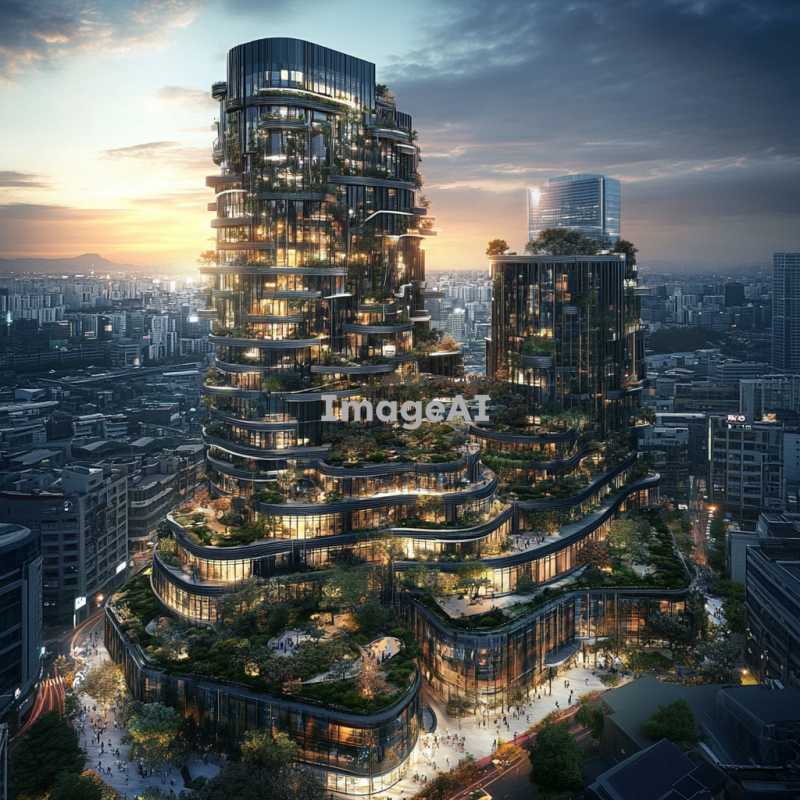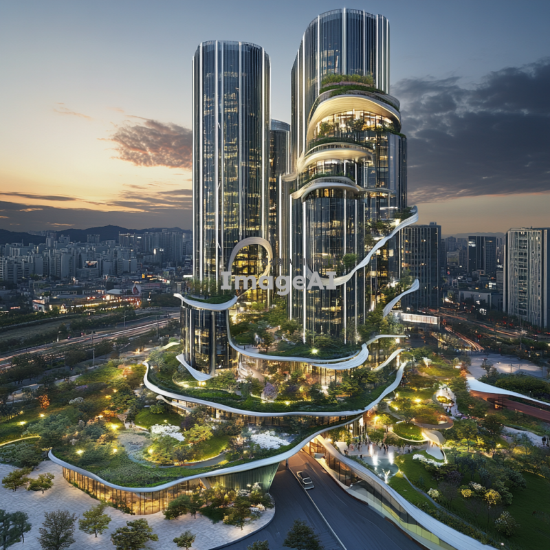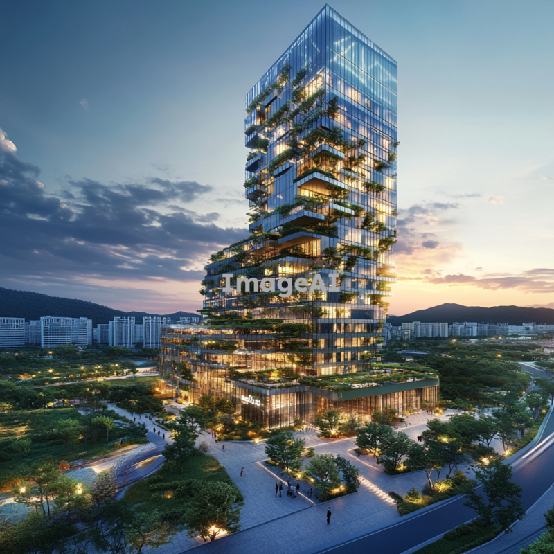 미래적인 디자인의 가상 빌딩, 유리와 금속 재질의 조화, 하늘을 배경으로 한 고층 구조물, 자연과 조화롭게 어우러진 녹색 테라스, 첨단 기술을 암시하는 디지털 패턴, 한국 전통 건축 요소가 현대적으로 재해석된 디테일, 주변에 작은 공원이 있는 모습, 일몰 시간대의 따뜻한 조명, 공상과학 영화에 나올 법한 분위기.
