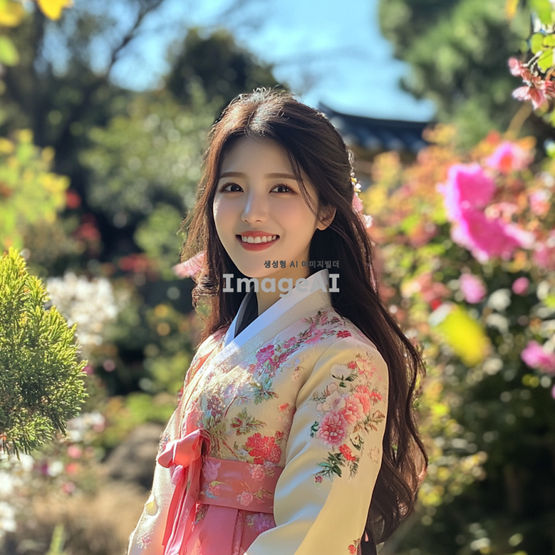20대 한국인 여성이 전통 한복을 입고 있는 모습. 그녀는 아름다운 정원을 배경으로, 햇살이 비치는 가운데 미소를 짓고 있다. 정교한 자수가 놓인 한복은 밝은 분홍색과 하얀색으로 이루어져 있으며, 그녀의 긴 머리는 자연스럽게 풀어져 있다. 주변에는 다양한 꽃들이 피어 있고, 부드러운 바람에 나뭇잎이 살랑거린다. 그녀의 표정은 평화롭고 행복해 보인다.