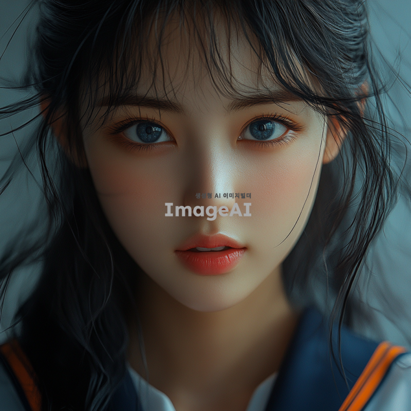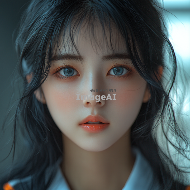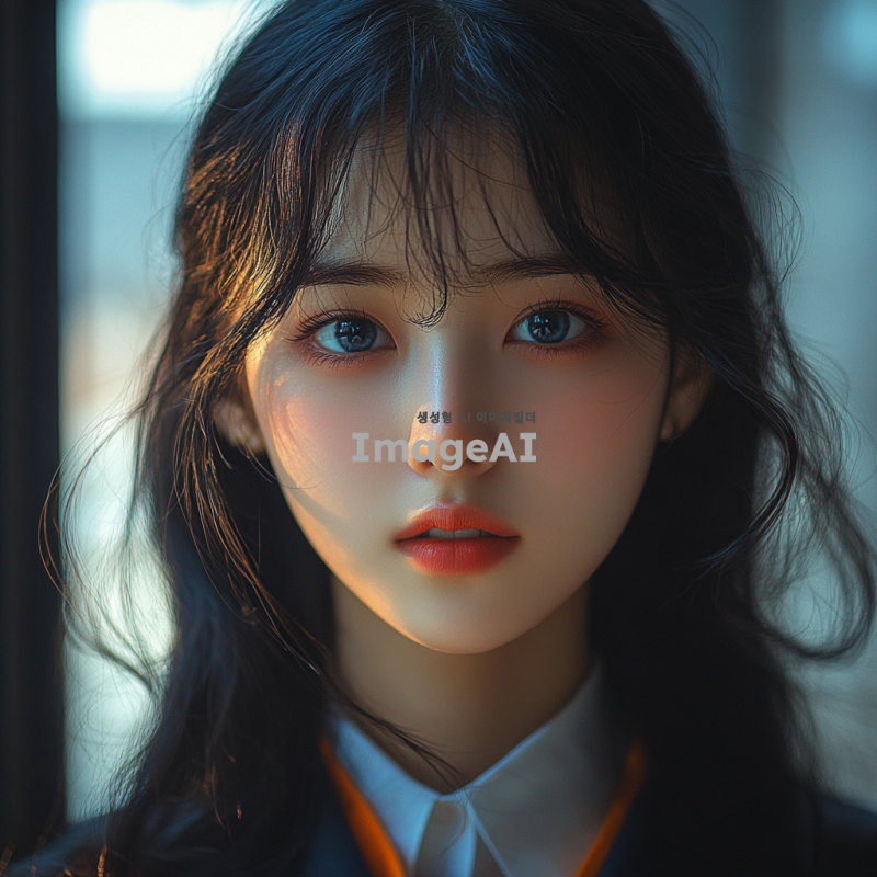 가슴까지 내려오는 흑발에 왼쪽에 주황색 브릿지가 있는 머리, 파란 눈동자를 가진 한국 여학생, 교복을 입고 있는 모습, 자연스러운 포즈, 밝고 청순한 분위기, 실내 배경.