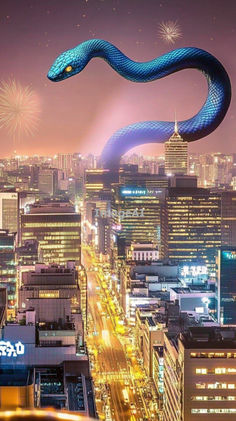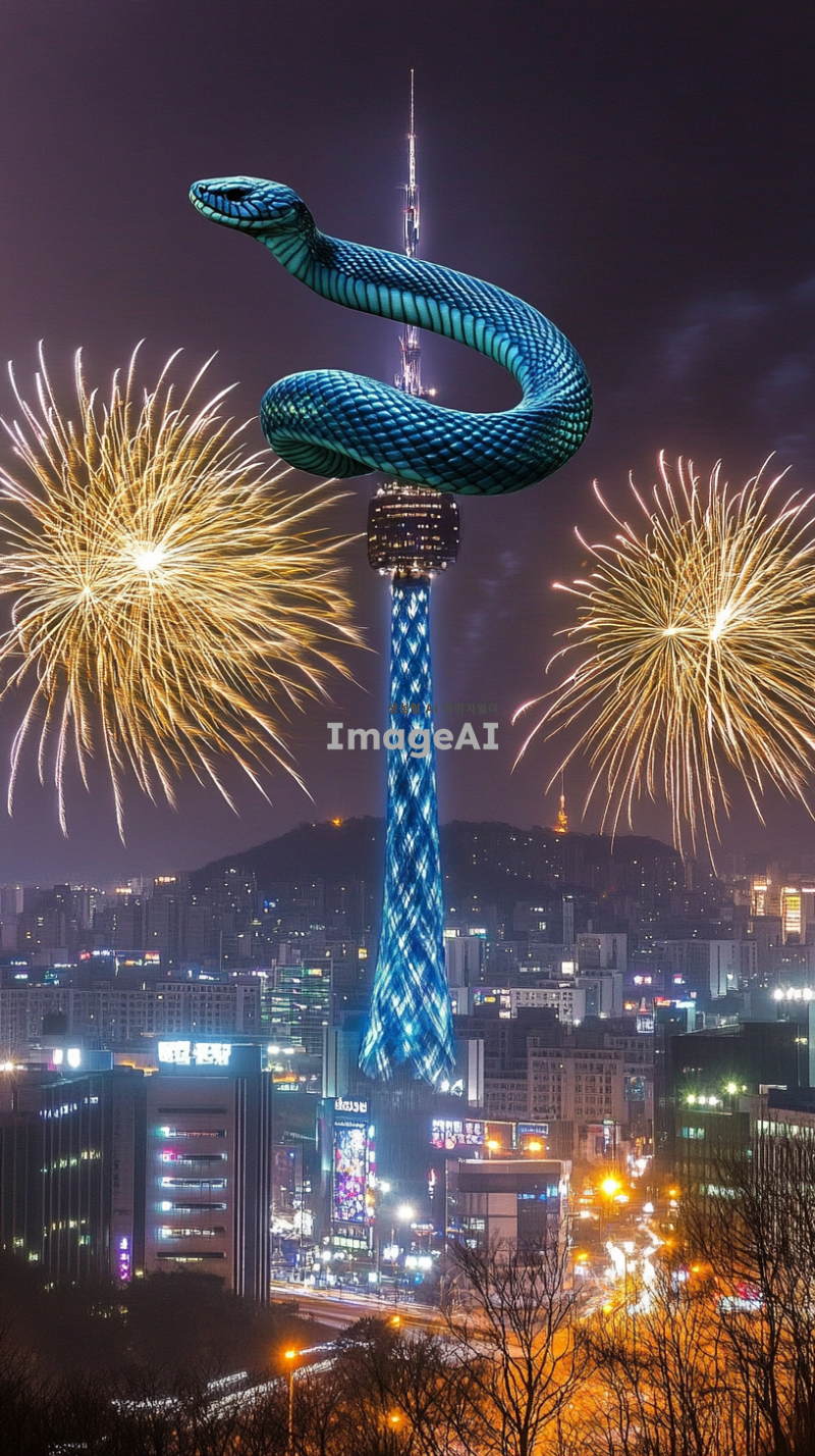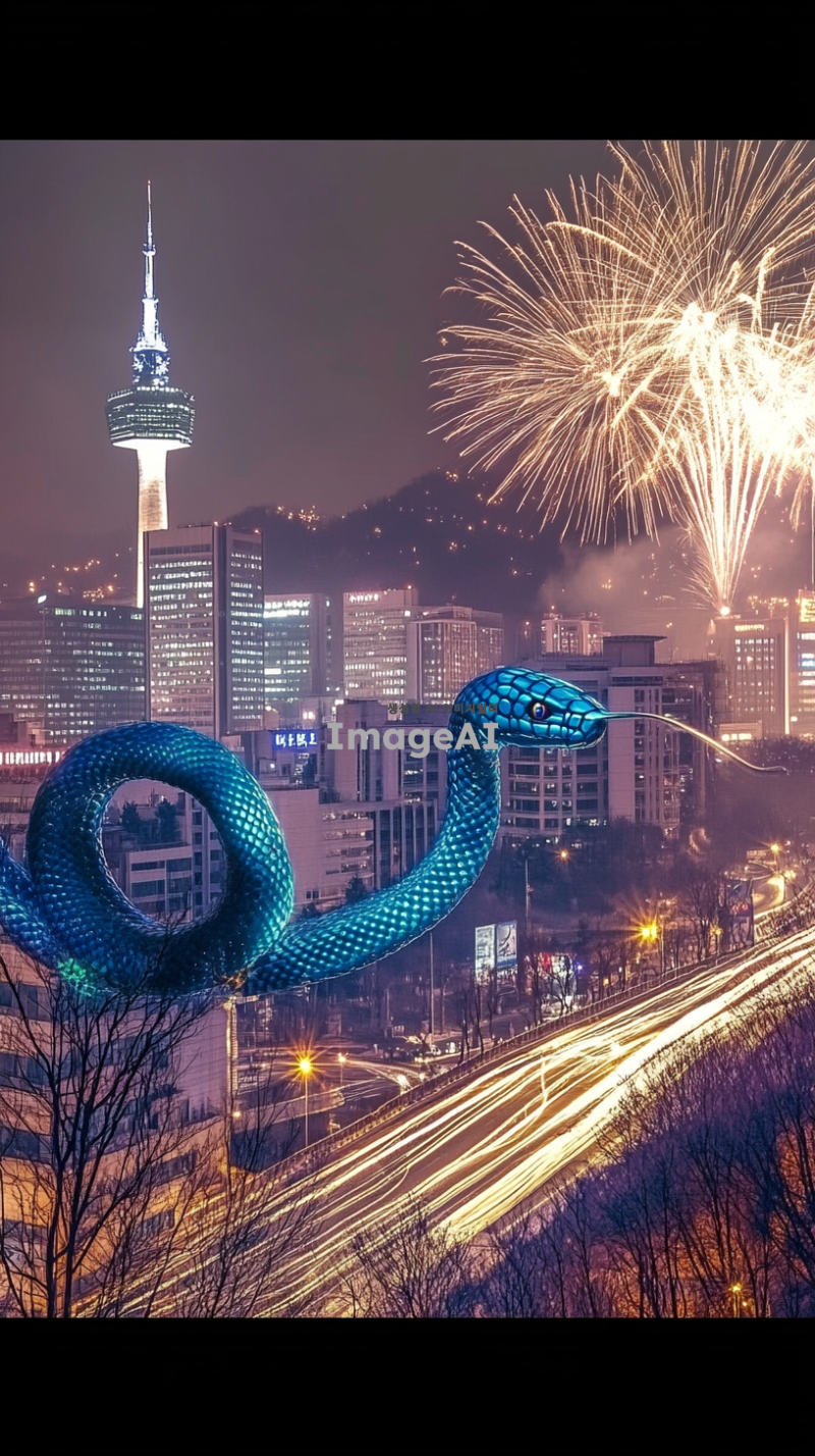 서울의 스카이라인 위로 남산타워가 보이는 장면, 푸른뱀이 빌딩 사이를 유유히 날아다니며 새해를 알리고 있는 모습, 뱀의 비늘은 빛을 반사하며 푸른빛으로 반짝이고, 서울의 야경과 조화를 이루며 신비로운 분위기를 자아냄, 하늘에는 불꽃놀이가 펼쳐지고, 도시의 불빛이 반짝이는 장면, 현대적인 건물들과 전통적인 요소들이 조화를 이루는 서울의 모습, 새해를 맞이하는 활기찬 분위기.