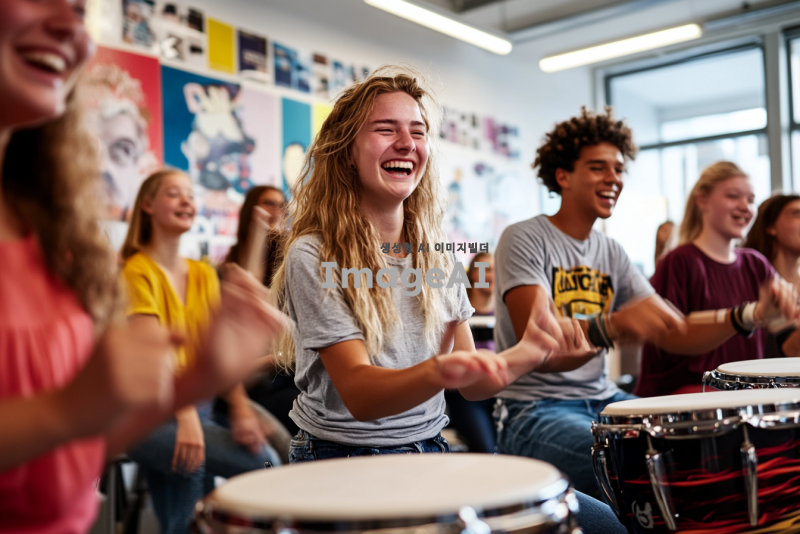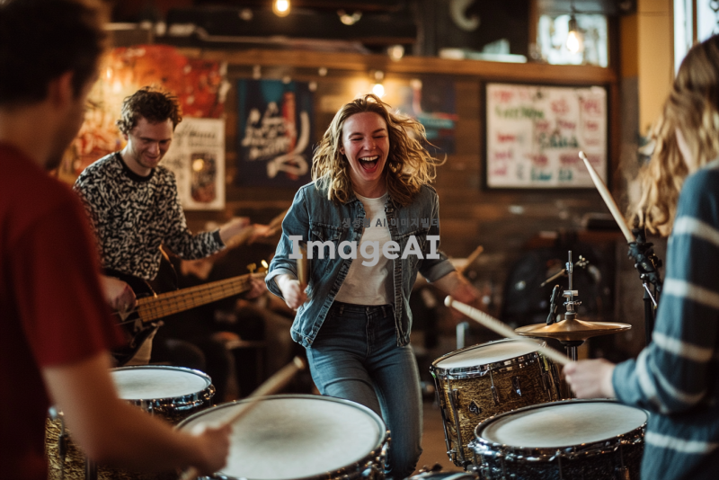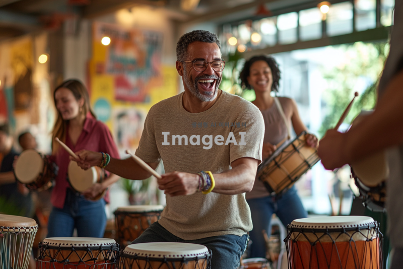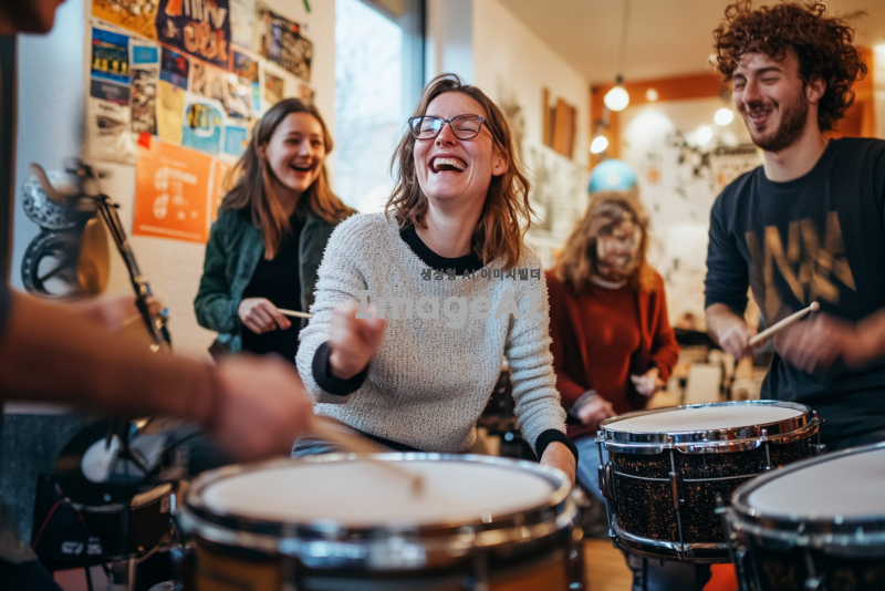 밝고 활기찬 분위기의 실내 공간에서 여러 명의 사람들이 함께 난타북을 치고 있는 모습. 사람들은 30~50대 연령대이며 성별로 다양하게 구성되어 있으며, 모두가 열정적으로 난타북을 치며 웃고 있다. 주변에는 다양한 타악기들이 놓여 있고, 벽에는 음악 관련 포스터가 걸려 있다. 참가자들은 캐주얼한 옷차림을 하고 있으며, 음악에 맞춰 신나게 움직이고 있다. 배경은 따뜻하고 환한 조명으로 가득 차 있다.