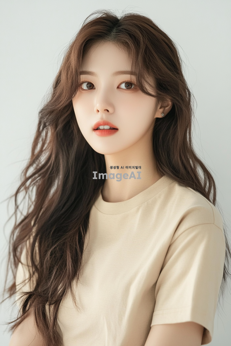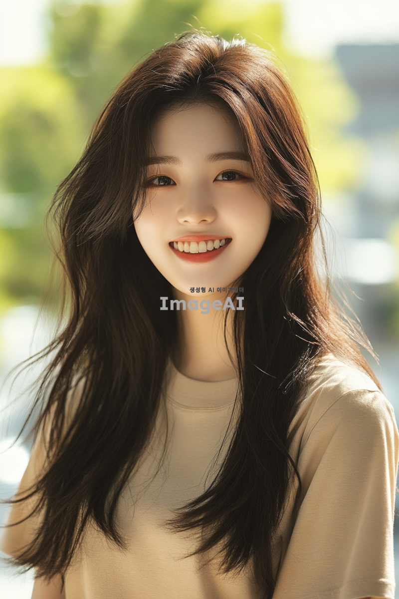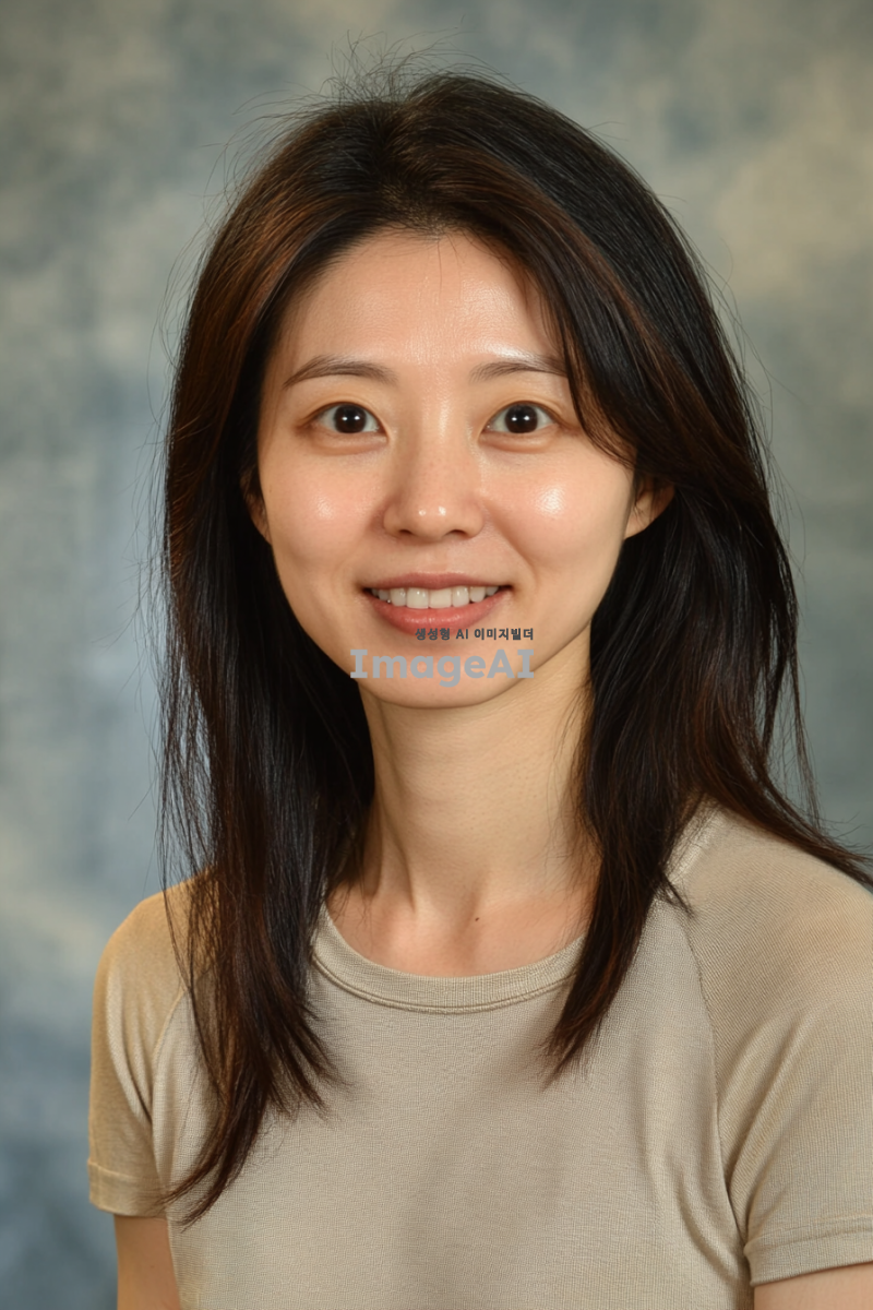 1985년생 한국인 여성, 직장인, 깔끔하고 신뢰가는 인상, 베이지색 라운드 티, 단정한 긴머리스타일, 밝은 배경, 자연스러운 미소, 정면에서 촬영한 증명사진 스타일, 조명은 부드럽고 균일하게