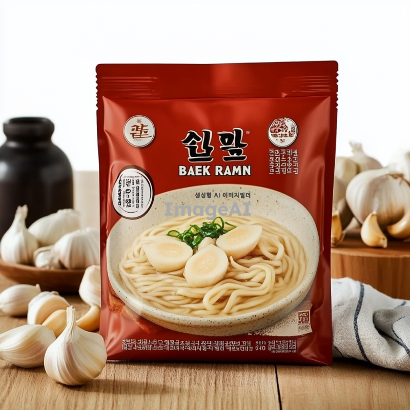 빽라면 패키지에 '빽통마늘라면'이라는 새로운 이름을 추가하고, 포장 디자인 곳곳에 신선한 통마늘 이미지와 마늘 조각을 배치하여 깔끔하고 현대적인 느낌을 주는 디자인. 배경은 밝고 깨끗한 톤으로 유지하며, 마늘의 신선함과 풍미를 강조할 수 있는 요소들을 포함.