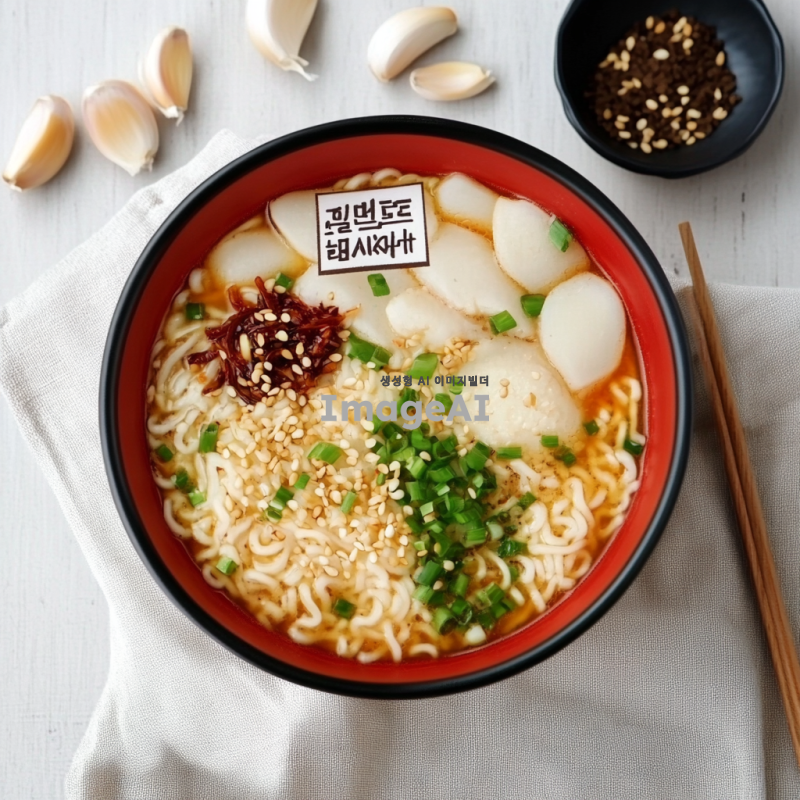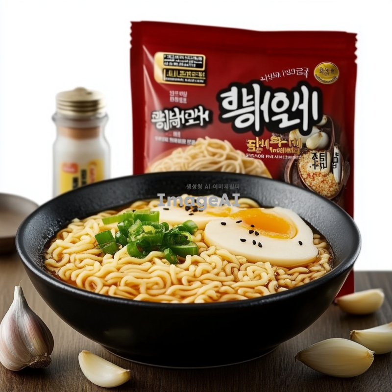 내가 업로드한 빽라면에 통마늘을 넣은 신제품 '빽통마늘라면' 에 관련된 이미지를 만들어줘. 내가 업로드한 사진에서 크게 바뀌지 말고, 이름만 빽통마늘라면으로 바꿔주고, 곳곳에 마늘과 관련된 이미지만 좀 넣어서 깔끔하게 만들어줘