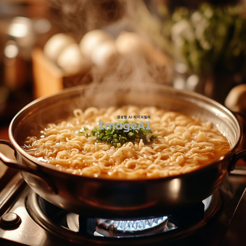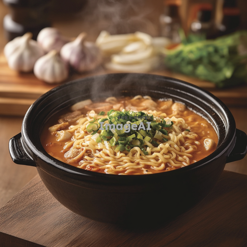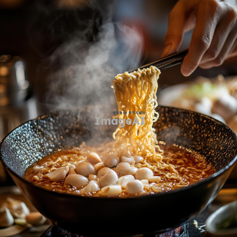 한국의 전통적인 주방에서 조리 중인 라면, 국물 속에 풍부하게 들어간 통마늘이 강조된 모습. 라면 그릇 주변에 신선한 통마늘이 자연스럽게 배치되어 있고, 국물의 깊은 색감과 면발의 질감이 잘 드러나도록 표현. 배경은 따뜻한 색조의 주방 인테리어로, 한국의 가정적인 분위기를 연출. 제품의 이름이 들어갈 수 있는 공간을 상단에 마련하여 깔끔하고 세련된 디자인으로 완성.