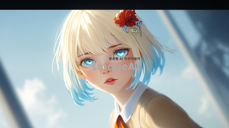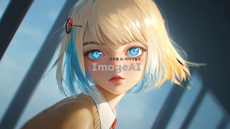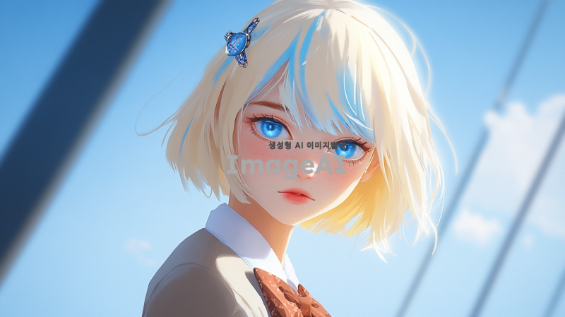 액세서리: 머리에는 예쁜 핀을 꼽고 있어요. 핀은 금속으로 된 섬세한 디자인으로, 아마 꽃이나 별 모양이 아닐까 상상해봅니다. 핀이 빛을 받아 반짝이며 소녀의 헤어스타일에 포인트를 주고 있습니다.