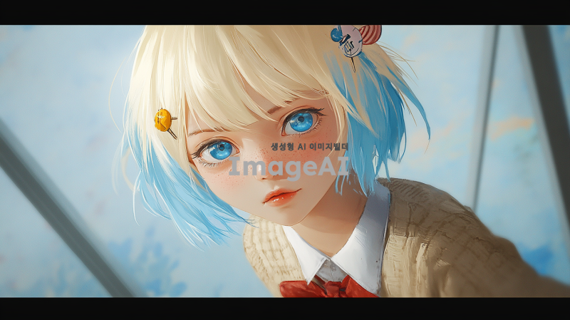 흰 머리에 단발 하늘색 브릿지 푸른 눈동자 머리에 키치한 핀 장난끼 많은 소녀