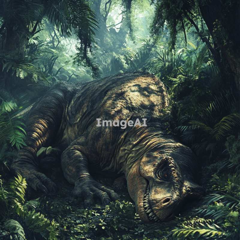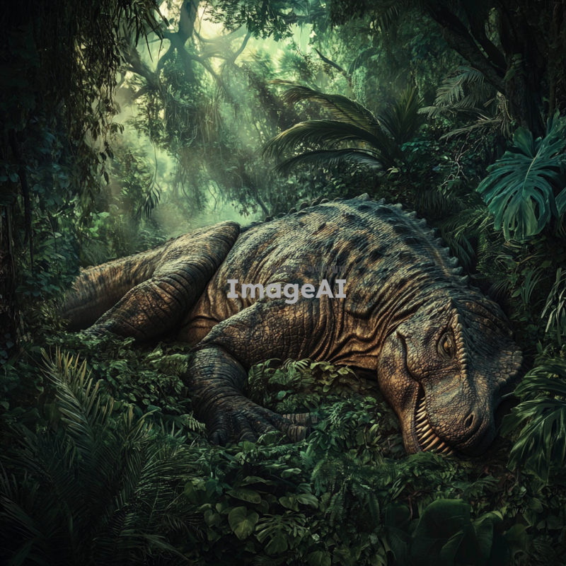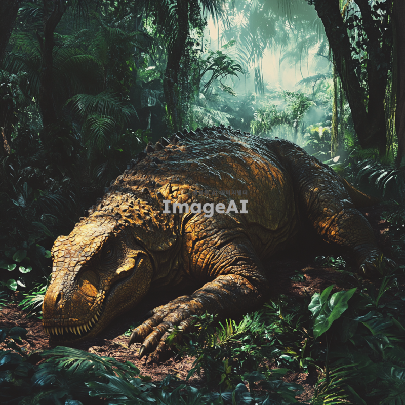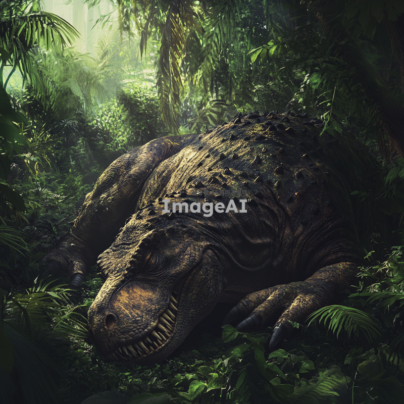 티라노사우루스 렉스가 열대 정글 속에서 웅크려 잠을 자고 있는 모습. 키 7미터, 몸길이 15미터, 몸무게 15톤에 달하는 거대한 티라노사우루스 렉스는 진갈색의 몸과 검은 줄무늬를 가지고 있으며, 온몸에는 단단한 비늘과 작은 돌기들이 돋보인다. 주변은 울창한 열대정글로 둘러싸여 있으며, 짙은 녹색의 나무와 덩굴식물들이 티라노사우루스를 감싸고 있다. 티라노사우루스 렉스는 눈을 감고 편안하게 잠들어 있는 모습으로, 평화로운 정글의 분위기를 자아낸다.