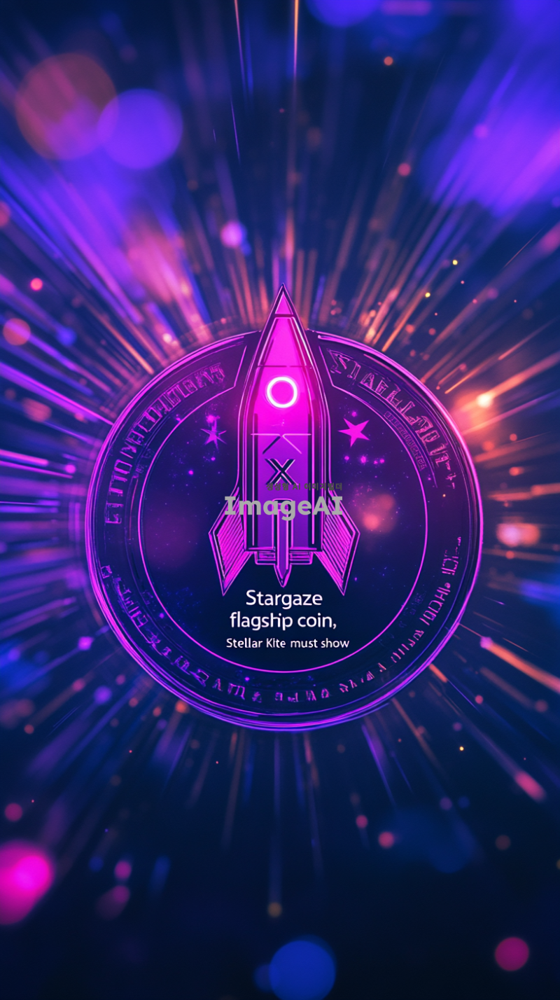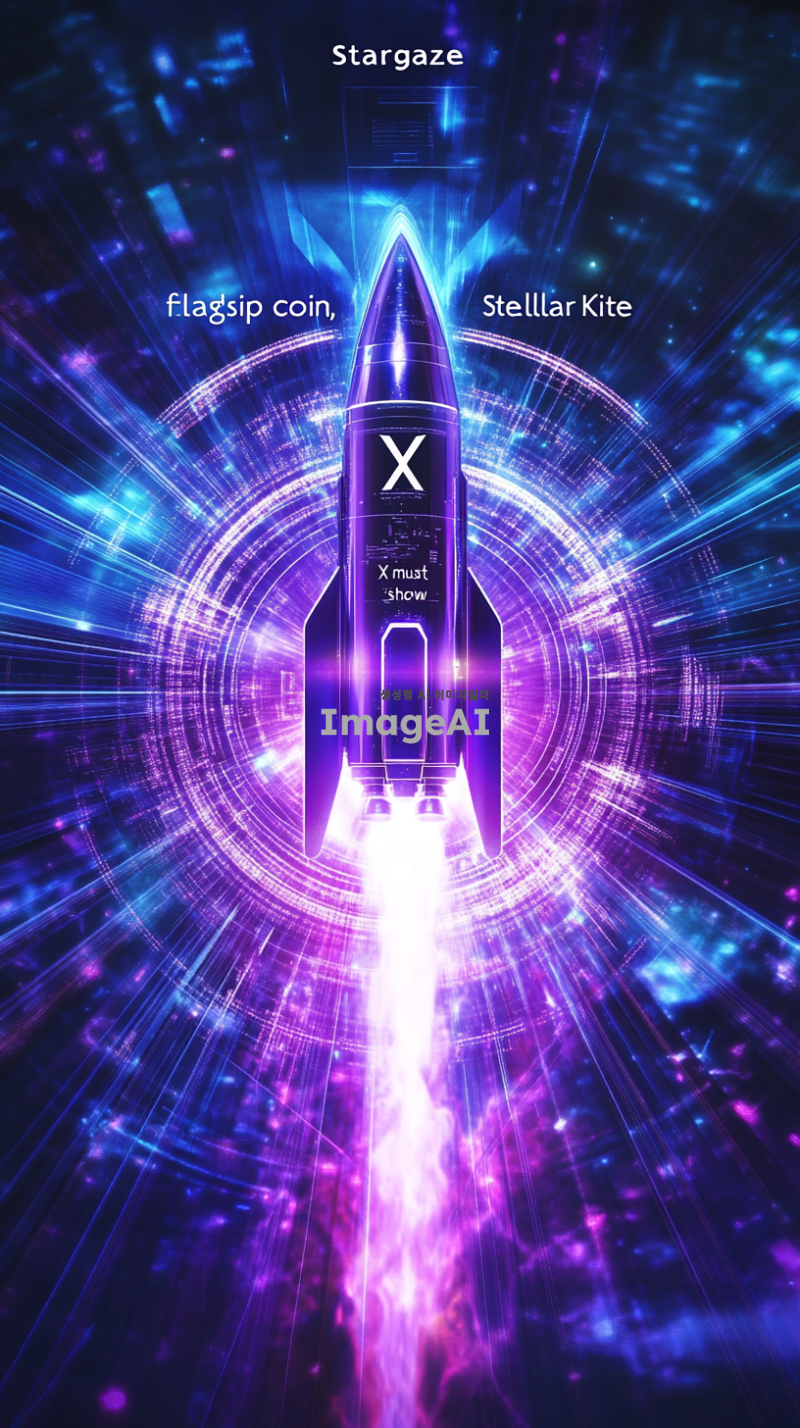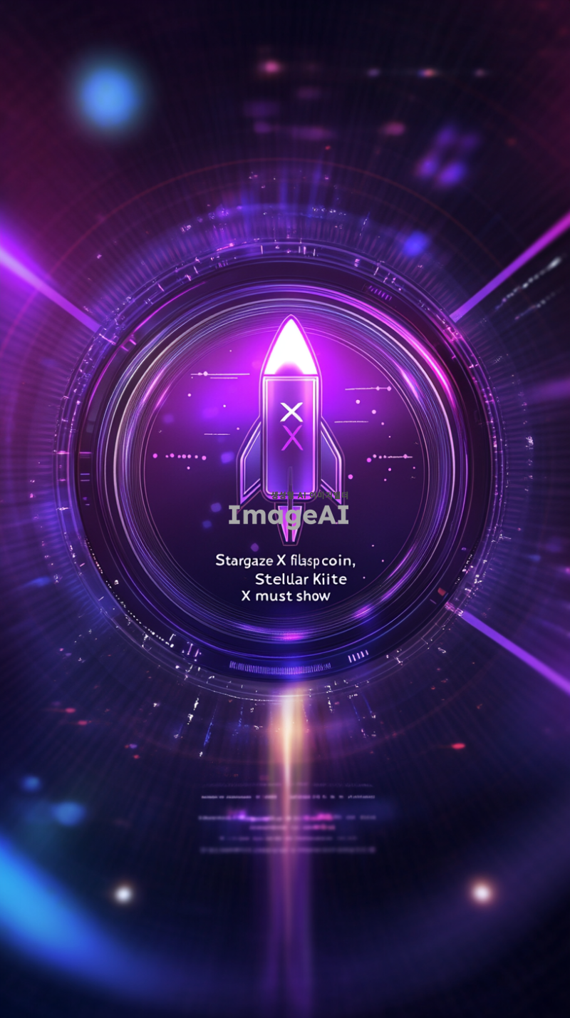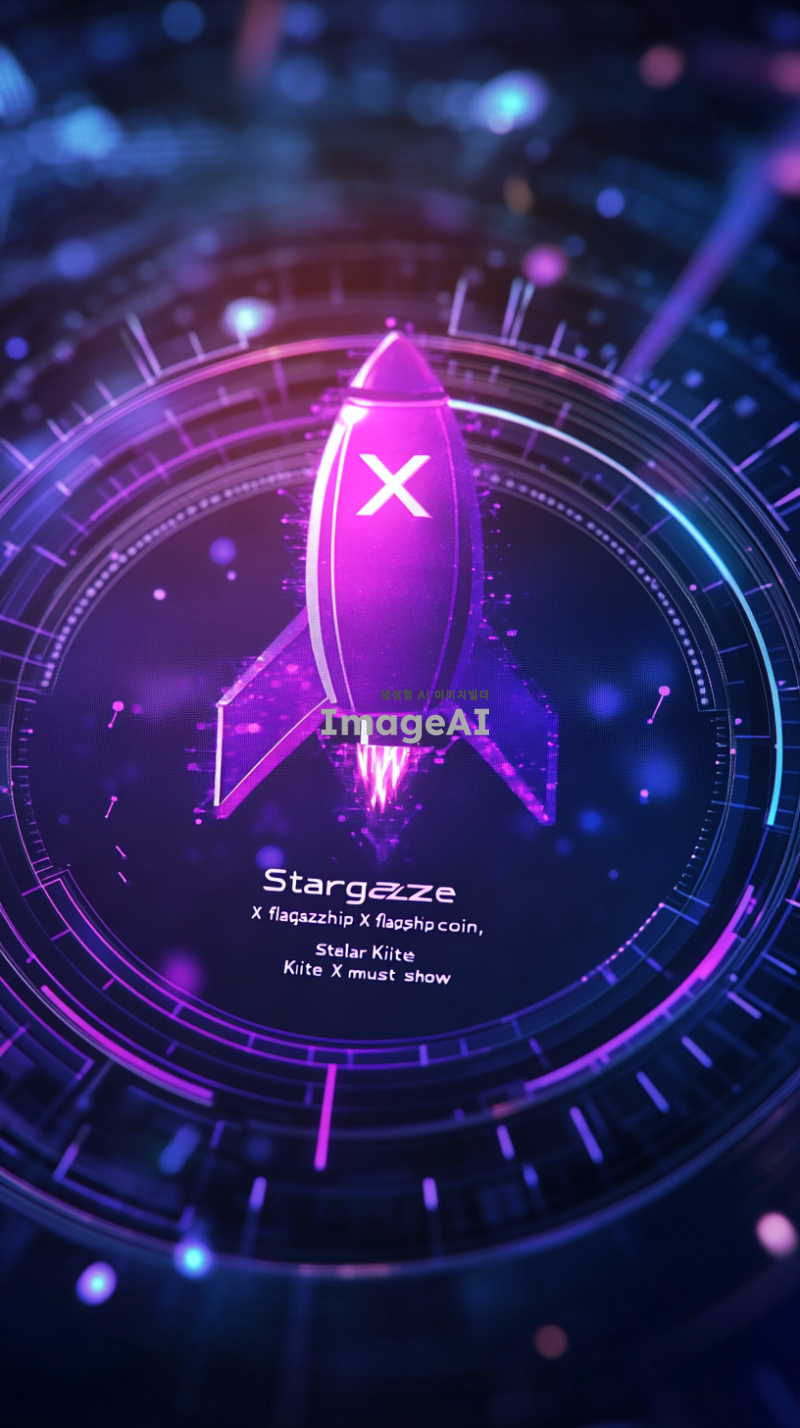 - "Stargaze X 대표 코인"인 Xbia의 아이콘으로, 보라색과 파란색 톤의 추상적인 로켓 디자인이 특징임. 배경은 로고를 강조하기 위해 흐릿하게 표현됨. 상단에는 'Stellar Kite'라는 텍스트가 주위에 쓰여 있음. 앞쪽에는 'X must show'라는 텍스트가 쓰여 있으며, 코인의 목적을 나타냄. 빛의 광선이 심볼 뒤에서 나오는 미래적인 느낌을 줌. 전체 스타일은 세련되고 전문적임.