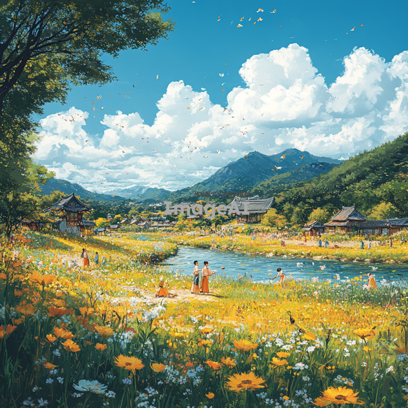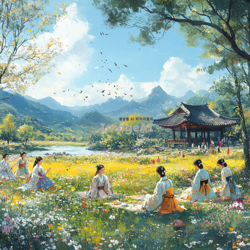푸른 하늘 아래 펼쳐진 광활한 초원, 곳곳에 야생화가 피어 있는 자연의 아름다움. 사람들이 전통적인 한복을 입고 있으며, 서로 웃으며 대화하고 있다. 주변에는 깨끗한 강물이 흐르고, 사람들이 강가에서 물놀이를 즐기고 있다. 멀리 보이는 숲속에는 새들이 자유롭게 날아다니고, 나무 위에는 다양한 과일이 열려 있다. 사람들은 자연에서 직접 수확한 음식을 나누어 먹으며, 평화롭고 만족스러운 표정을 짓고 있다. 기술의 흔적은 전혀 보이지 않으며, 자연과 조화롭게 살아가는 모습이 강조되어 있다.