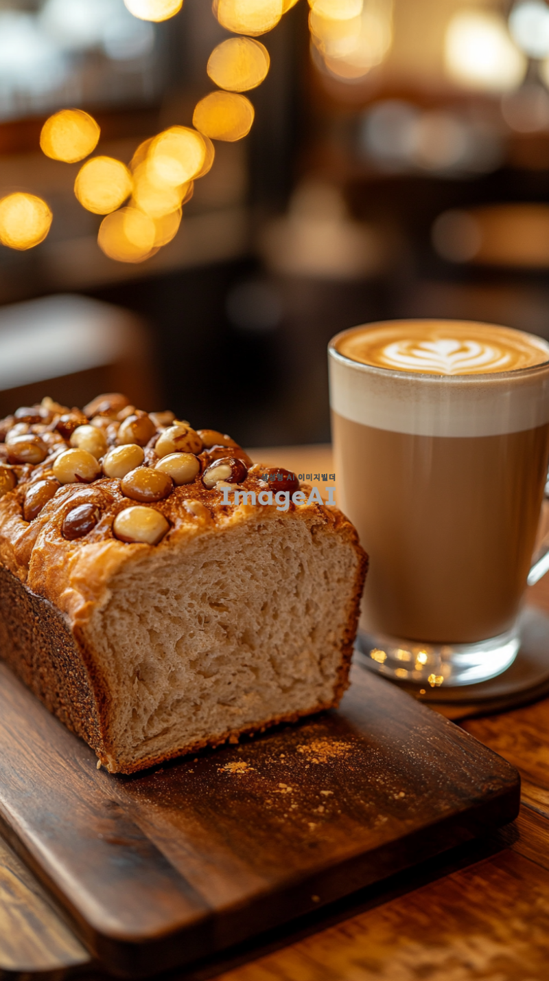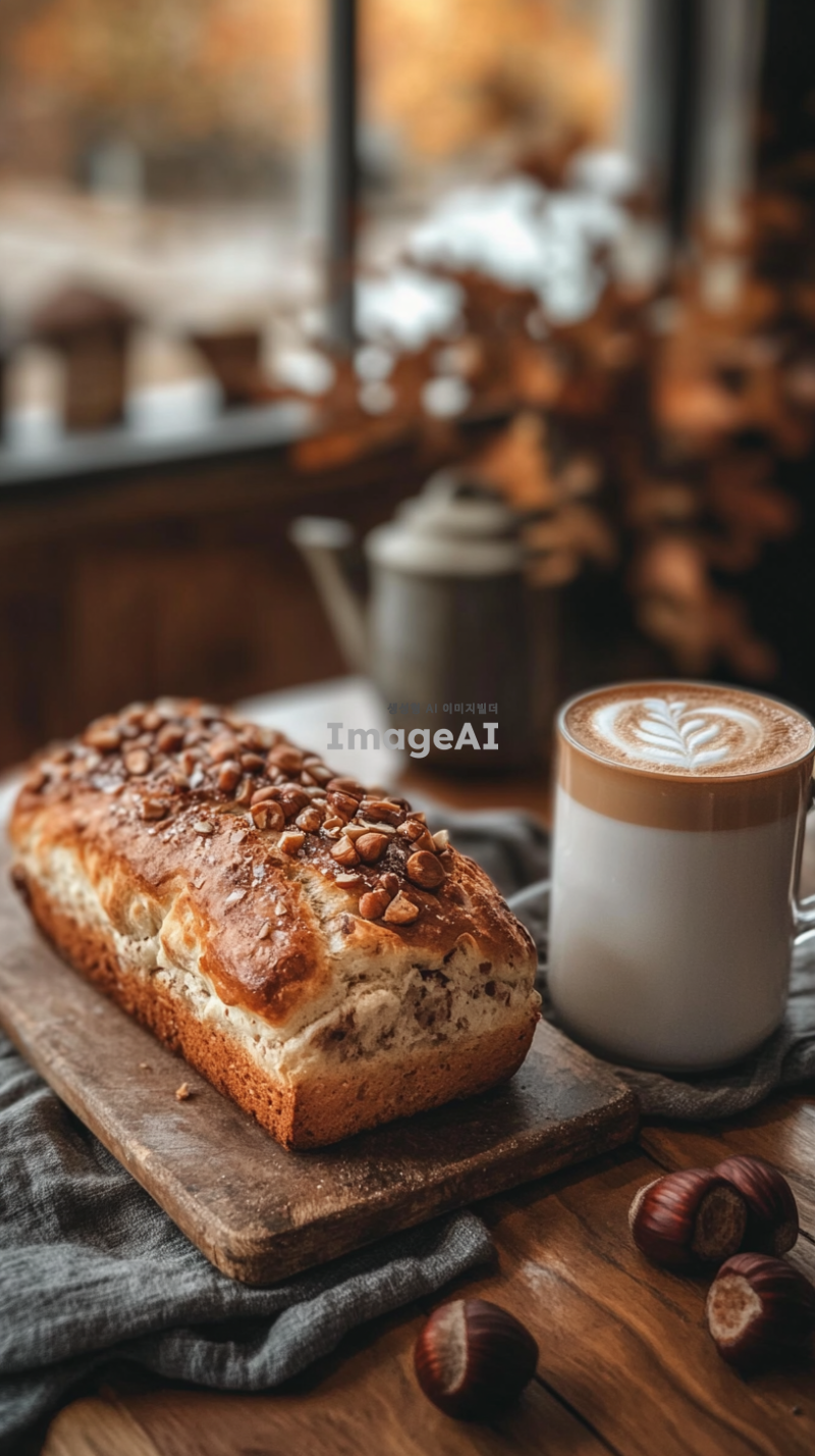 따뜻한 분위기의 카페 테이블 위에 놓인 밤이 많이 들어간 식빵, 식빵은 겉이 바삭하고 속이 부드러워 보이며 밤이 듬뿍 박혀 있어야 함. 식빵 옆에는 원형 유리잔에 담긴 밤라떼가 놓여 있으며, 라떼는 부드러운 크림과 함께 고소한 밤의 향이 느껴지는 색감으로 표현. 전체적으로 따뜻하고 아늑한 느낌의 조명, 가을의 따뜻한 색감과 잘 어울리는 배경.