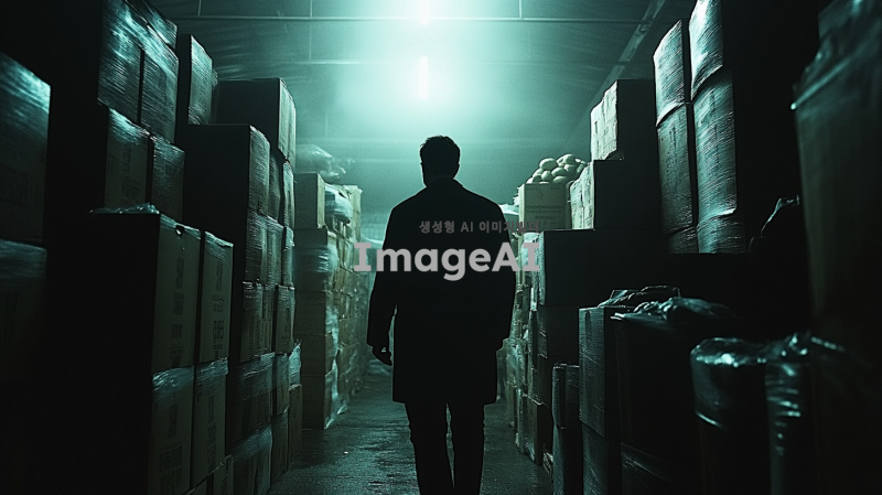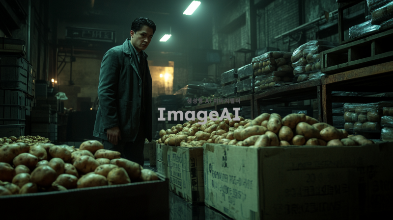 어두운 창고 내부, 수많은 고구마 더미 사이에서 탐색하는 로이드 포저. 그는 날카로운 눈빛으로 주변을 살피며, 범죄 조직의 단서를 찾고 있다. 창고의 어두운 조명과 그림자가 긴장감을 더하며, 로이드는 신중하게 움직이고 있다. 그의 옷차림은 평범한 작업복으로 위장되어 있으며, 주변에는 고구마 상자들이 어지럽게 쌓여 있다. 로이드의 표정은 집중되어 있으며, 손에는 작은 손전등이 들려 있다.