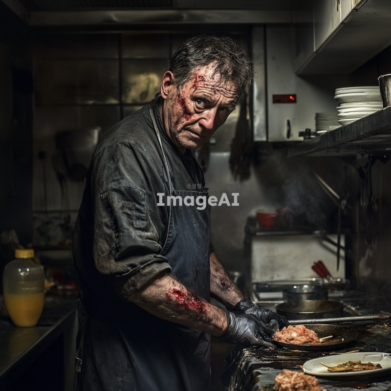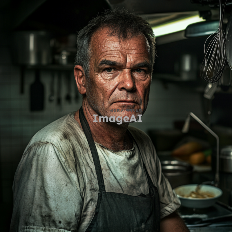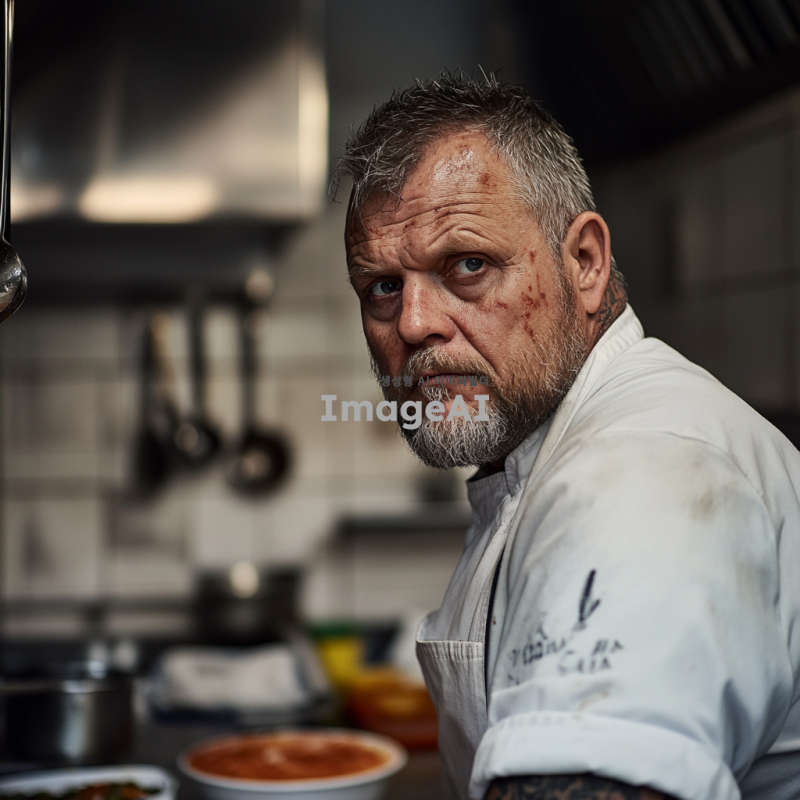 60세 외국인 남성 요리사, 얼굴에 흉터가 있는 건장한 체격의 빅터 칼슨. 작은 음식점의 주방에서 일하는 모습. 전쟁의 여파로 강제 징집된 경험이 있는 듯한 복잡한 표정. 주방의 배경은 작고 소박하며, 요리 도구들이 정리되어 있는 모습. 주변에는 음식 재료들이 놓여있고, 칼슨은 깊은 생각에 잠긴 듯한 모습. 전쟁 속에서 생존을 위해 힘겹게 살아남은 듯한 강인한 인상을 주는 이미지.