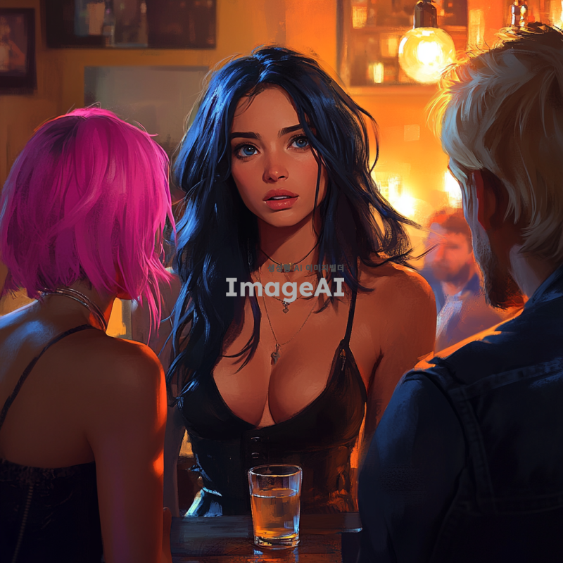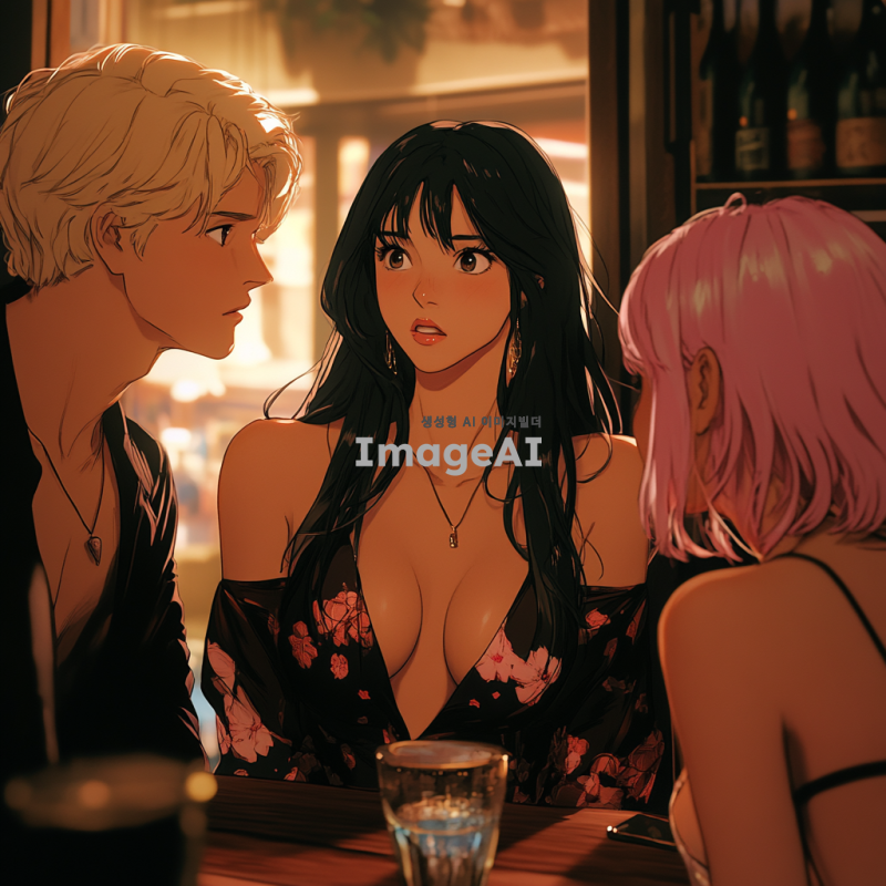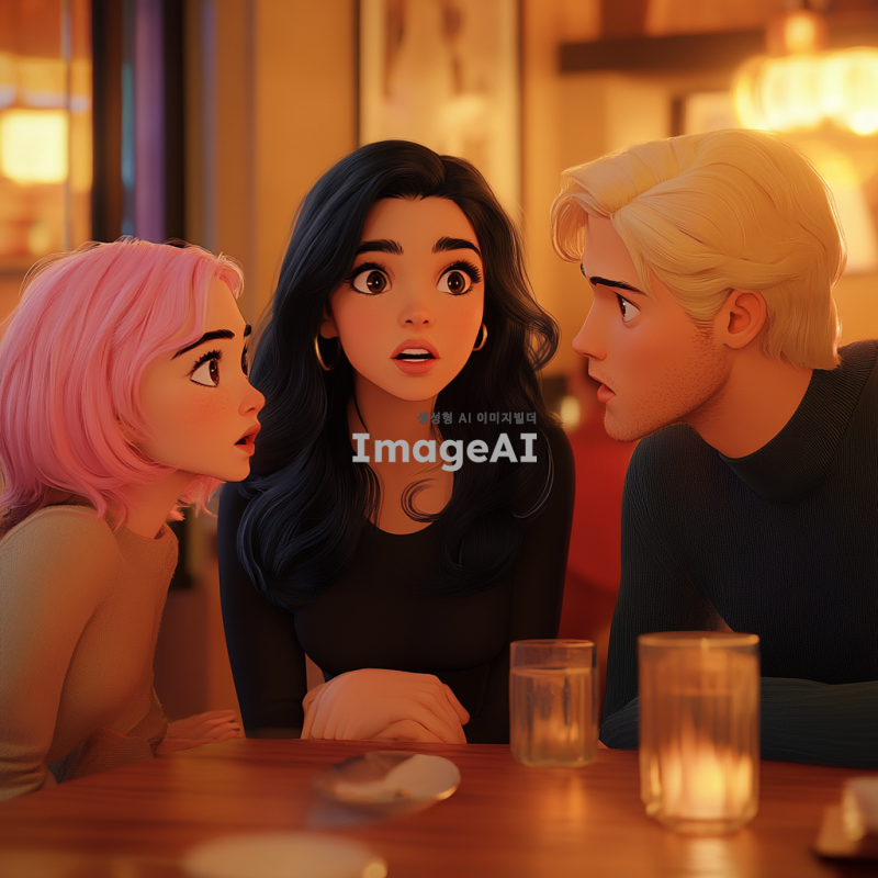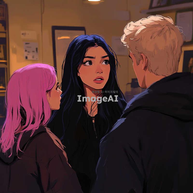 검정 긴 머리의 여자가 금발의 남자와 진지하게 상의하는 장면, 옆에서 분홍 단발 머리의 여자 아이가 호기심 가득한 표정으로 두 사람의 대화를 몰래 엿듣고 있는 모습. 실내 배경, 따뜻한 조명, 현대적인 분위기.