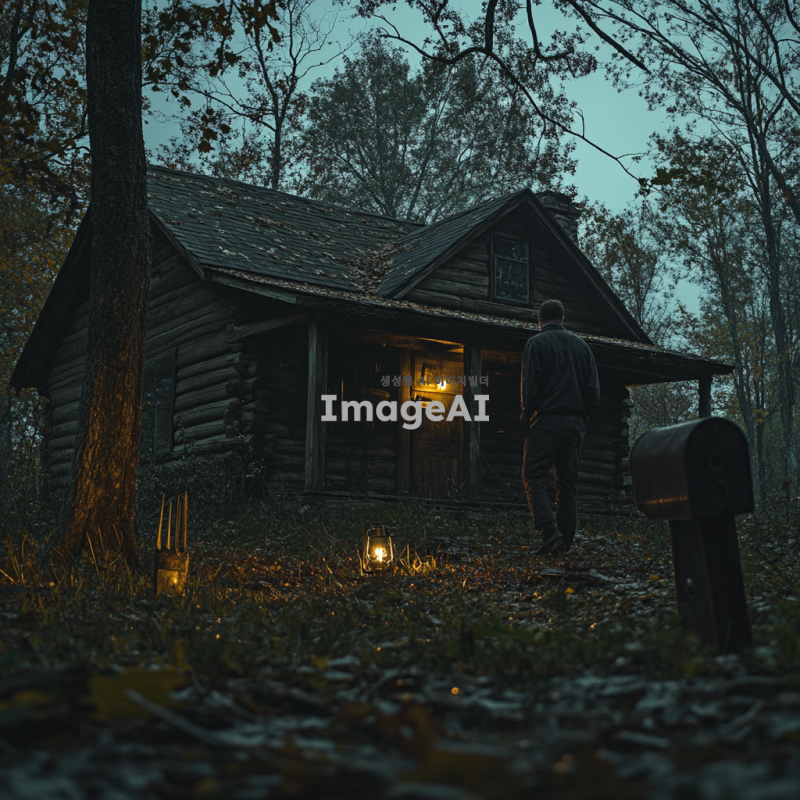 오브제: 녹슨 열쇠, 낡은 우편함, 나무에 꽂혀있는 도끼, 수상한 발자국, 랜턴 의 배경을 만들어줘