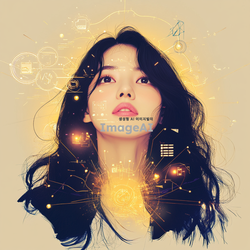 검은 긴 머리를 가진 한국인 여성이 밝고 활기찬 표정으로 눈을 반짝이며 아이디어가 떠오른 순간을 표현한 장면. 여성의 얼굴은 희망과 창의성으로 가득 차 있으며, 주변에는 그녀의 아이디어를 상징하는 다양한 아이콘이나 빛나는 요소들이 흩어져 있다. 배경은 깔끔하고 현대적인 느낌을 주며, 따뜻한 조명이 그녀의 얼굴을 부드럽게 비추고 있다.