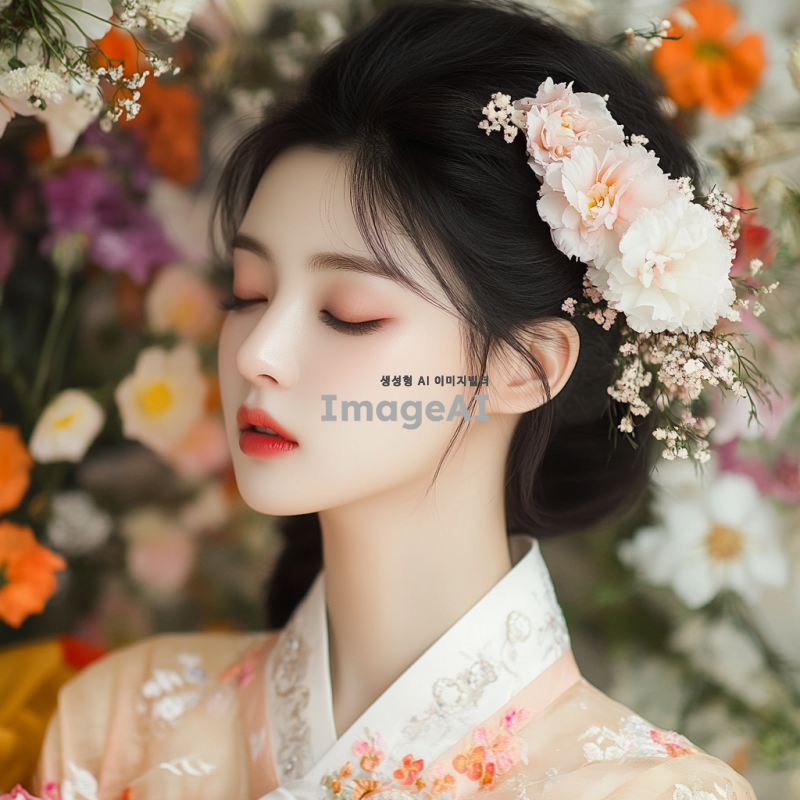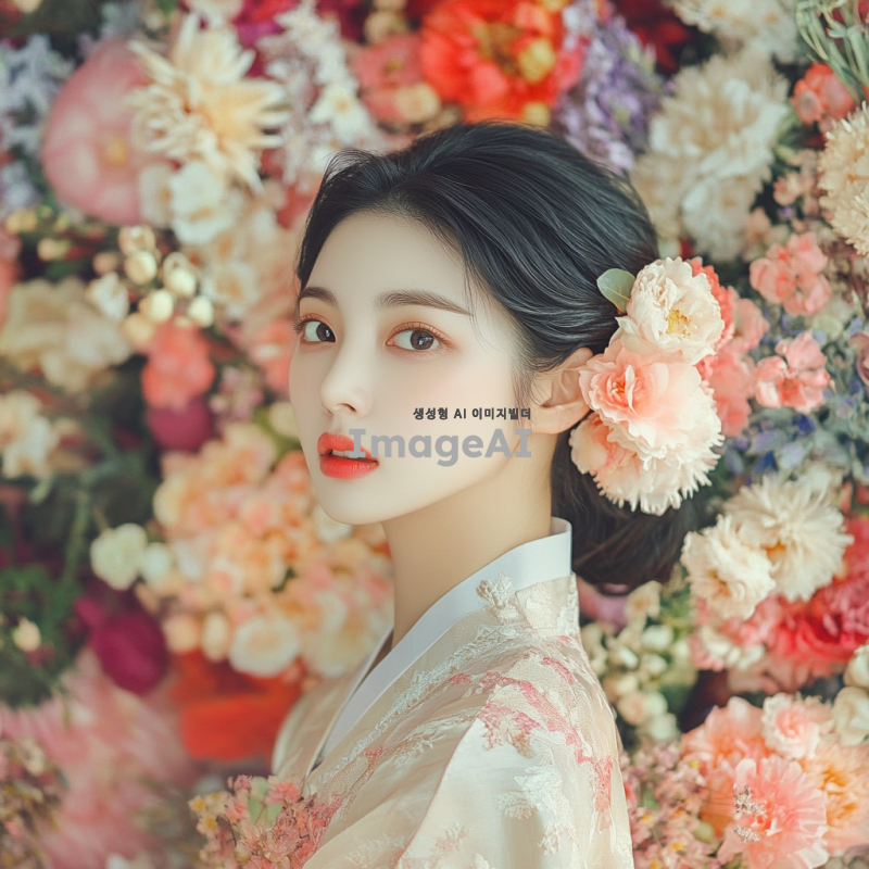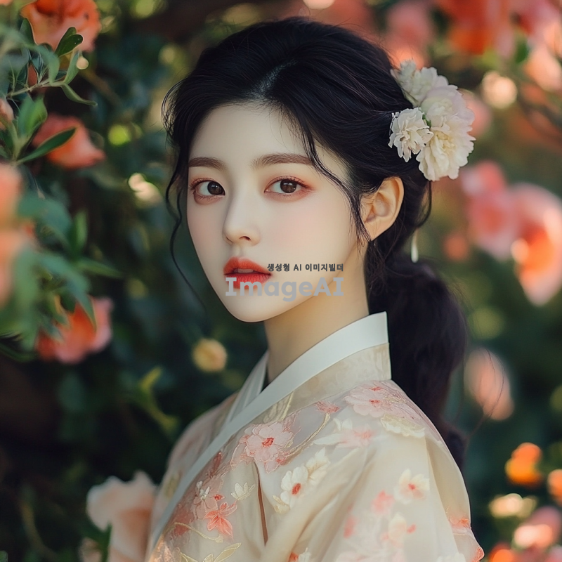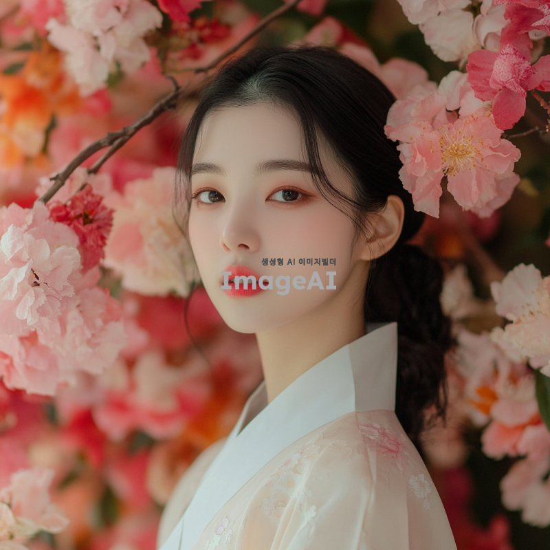 한국의 전통적인 아름다움을 현대적으로 재해석한 여성, 깨끗하고 맑은 피부, 자연스러운 메이크업, 부드러운 핑크와 코랄 색조의 립스틱, 은은한 하이라이트와 블러셔, 실크 같은 검은 머리카락, 세련된 한복 스타일의 현대적 의상, 배경은 화사한 꽃과 자연 요소, 조명은 부드럽고 따뜻한 느낌.